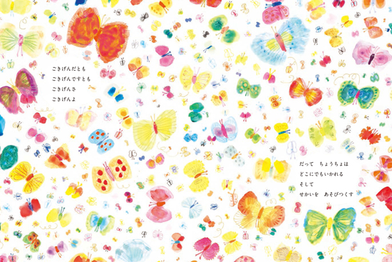 おんなの子の黄色の髪飾りとなり、やわらかい黒猫のあたまやもぎたての果実にそっとくちづけ、何のためらいもなく窓の外へ、見たこともない新しい世界をもとめ飛んでいく。ページからページへひらひらと舞う色鮮やかな「ちょうちょ」たちの自由奔放なかわいらしい姿。すきなところではねを休め、すきなだけ世界を味わい遊びつくし、命の果てるまで飛んでいる。絵本をひらいたその瞬間から、心がちょうちょのように軽やかに、そして大胆に解き放たれます。