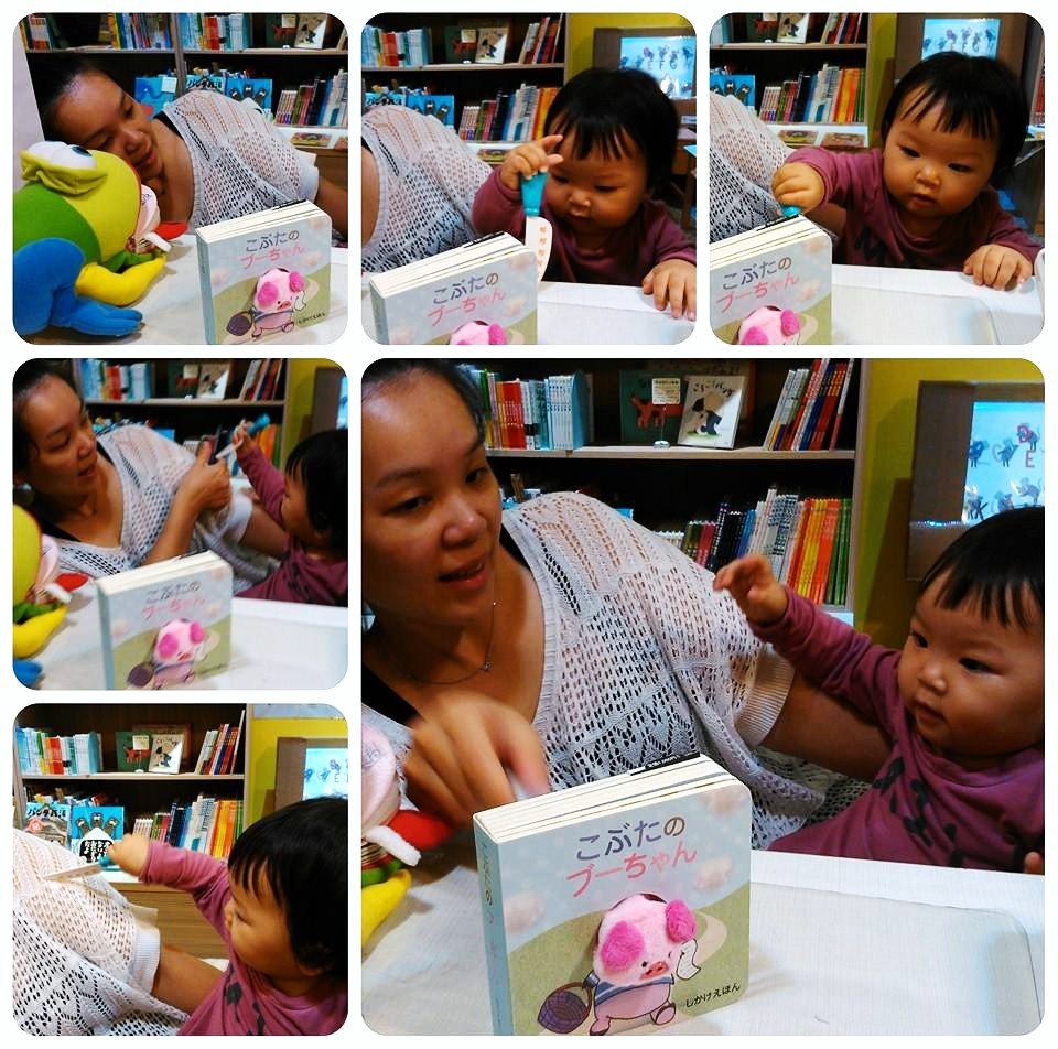 這位今天第一次來的媽媽超可愛,一進門就帶著寶寶晃呀晃,想要找適合給小寶寶的書,結果看來看去,寶寶最有反應的是這本This Little Piggy,這是一本可以將手指從後面放進去變成手指謠的有趣硬頁書。不過,其實寶寶當天最愛的不是書,是一把玩具菜刀啦,咦?噢不~不要拿小菜刀攻擊媽媽啦!