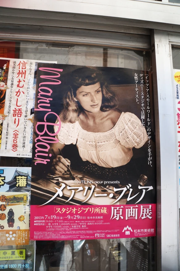我們結束WWOOF準備從松本到東京的那一天,留了一整個下午的時間在松本市觀光,一般人想到松本,就會想到烏溜溜的松本城!偏偏我對走進松本城裡面一點興趣也沒有,還被夥伴虧說這樣還算個日文系學生嗎!因為那時我還抱著希望可以搭車去安曇野看岩崎知弘美術館哪!松本城之前已經在外頭拍過照片了,因此對我來說一點吸引力也沒有,想一想,不如就走去看個松本市立美術館好了,結果就在我們寄放行李的時候,我看到一幅大廣告,上面公告的資訊是瑪麗·布萊爾的繪本原畫展。