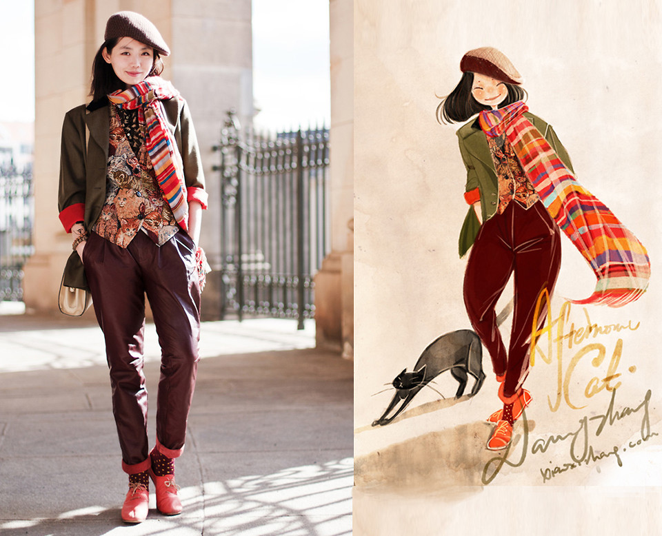 她最常見的作品是將一張穿搭照與插畫合併在一起,呈現出多元且具個人特色的時尚風格。若是只單看照片或是插畫,就已經很棒的作品了,而且她畫的衣服不只像,還能捕捉到服飾的特色、質感、顏色,還有照片中的氛圍,呈現與攝影相異卻不衝突的美感,兩者合在一起張張都是傑作。