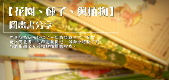 你喜歡花草植物嗎?一起來尋找中文、日文、英文圖畫書中的秘密花園吧!活動中將按下列四個主題來介紹植物相關的繪本。