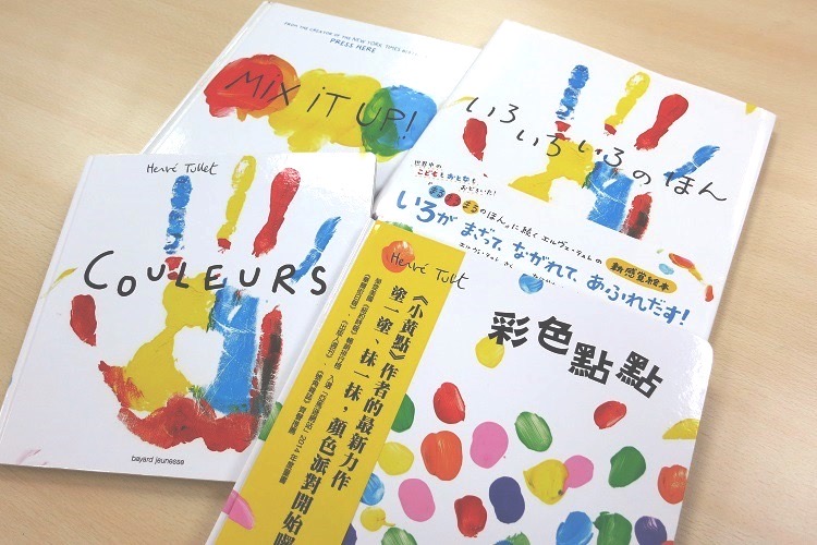 最初在構想這本書的書名時,可真是令人想破頭了。原書法文版的書名是《Coleurs》,就是顏色的意思,英文版採用書中混色的概念取作《Mix It Up!》,和小黃點的英文書名《Press Here》一樣是用動詞指令當作書名,連封面也換成混色的設計,非常新鮮且引人矚目。而日文版則沿用前一本小黃點書名的邏輯《まるまるまるのほん》(圓圓圓的書),稱作《いろいろいろのほん》(顏色顏色顏色的書)。