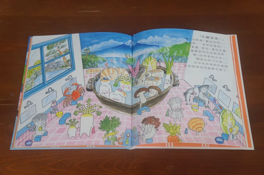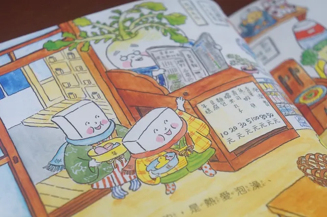 阿年與阿糕帶著洗澡用具前往澡堂,裡頭有各式各樣的浴池,像是醬油足浴池、黃豆粉池,也有三溫暖烤箱和暖呼呼的什錦火鍋池,這本書的最大看點就是滿滿的日式元素!作者與插畫家巧妙地將令人垂涎的美食擬人化,並結合日本澡堂傳統文化,獻上這本充滿想像力的美食繪本,壽司在醬油池泡腳、糰子在黃豆粉上滾來滾去、日式麵包擠在烤箱、年糕豆腐香菇蘿蔔泡在海鮮火鍋裡,讓人看得口水直流,但關於澡堂的細節卻一點也沒少,從蝴蝶頁開始便暗示著待會兒會出現的元素。仔細觀察澡堂的入口,不同食物的入場泡澡費不盡相同;黃豆粉池旁有美麗的日式庭園造景;火鍋大浴池的牆上是經典的富士山壁畫;而泡完澡後,當然要來一杯冰涼的牛奶!