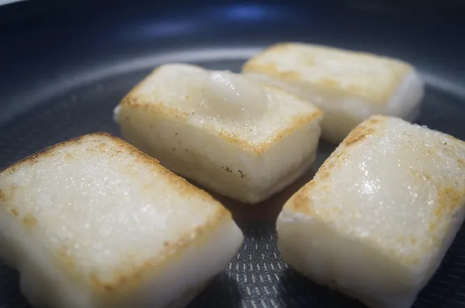 3. 小火慢煎日式年糕,上色後翻面,煎到澎澎、中間有鼓起時超可愛。可以刷一層醬油直接吃,四面焦焦脆脆、中心柔軟的狀態最好吃,如果想吃甜的,裹上黃豆糖粉,或放進紅豆甜湯裡也很棒。