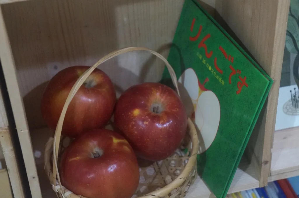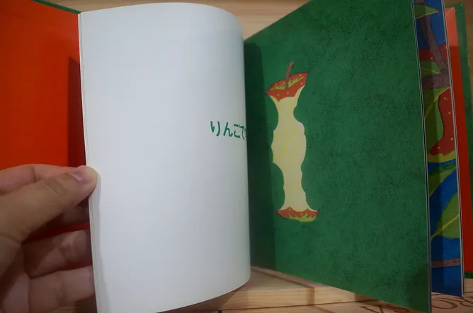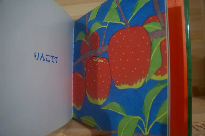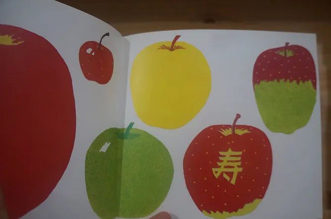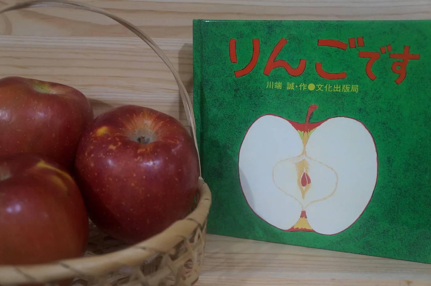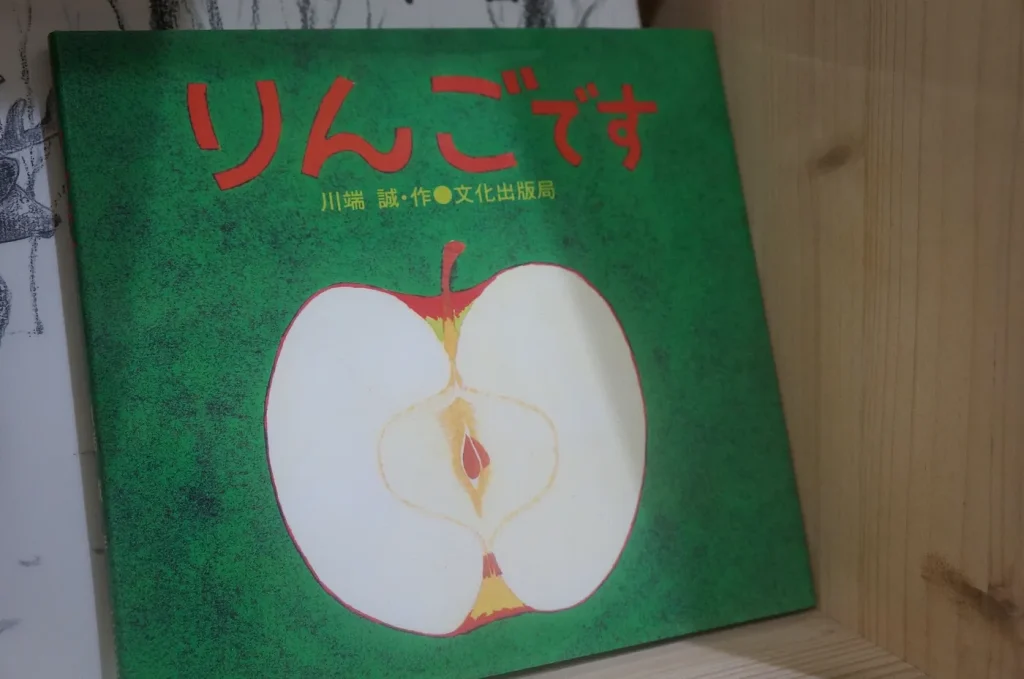 《りんごです》(這是蘋果)是日本童書作家川端誠於 1984 年出版的作品,這本書的內容非常簡單,說穿了結構之後,幾乎人人都能創作一本,但很可惜我們就是沒有作家的創意呢!全書最重要的一句話「りんごです」(這是蘋果)在每一頁的左側一次又一次地出現,右側的畫面則從咬了一口的蘋果、吃剩的蘋果核、小小的種籽、發芽的幼苗、盛開的白花、結實累累的果樹,到男孩桌上的蘋果片,全都是蘋果。