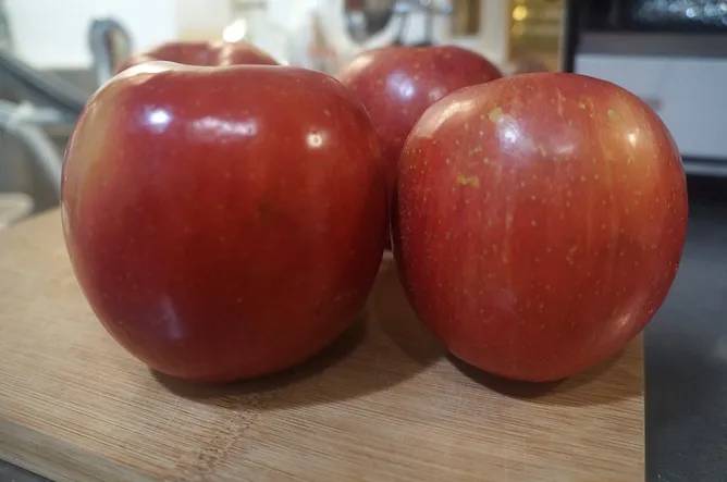 3. 將蘋果洗淨,蒂頭處一公分處下刀切片。