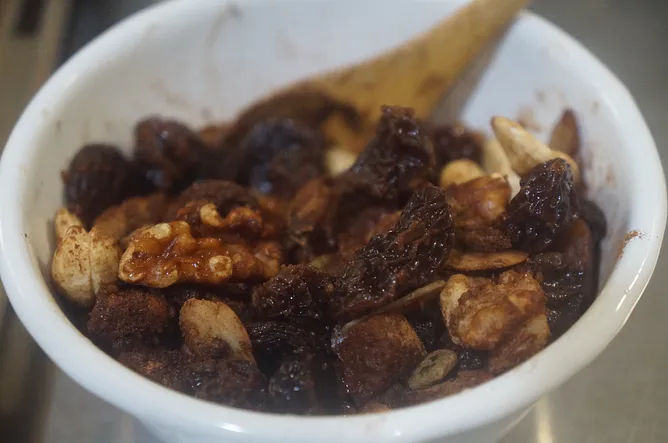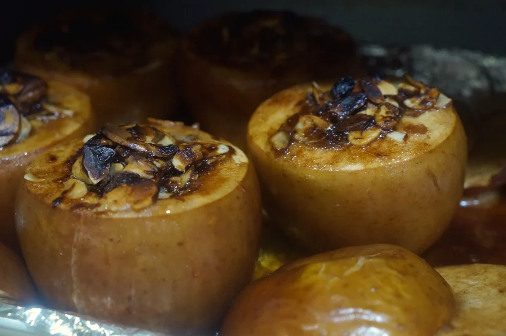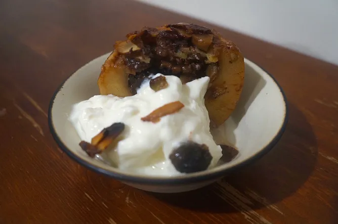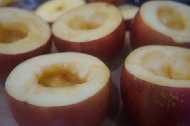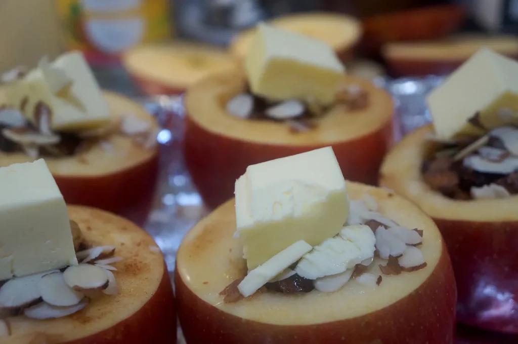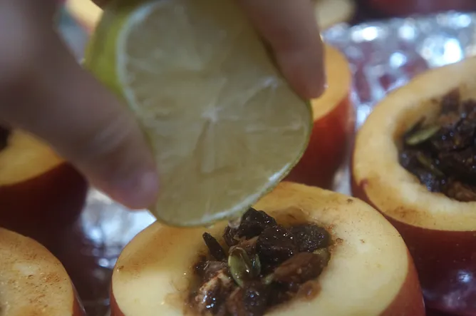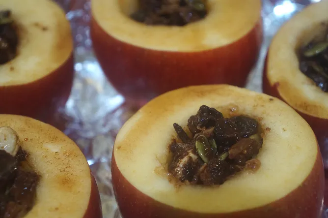 6. 混合酒漬果乾、堅果、糖、香料,填入蘋果中。