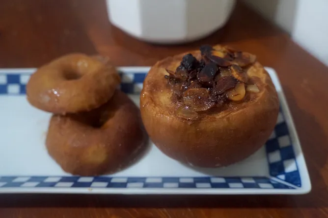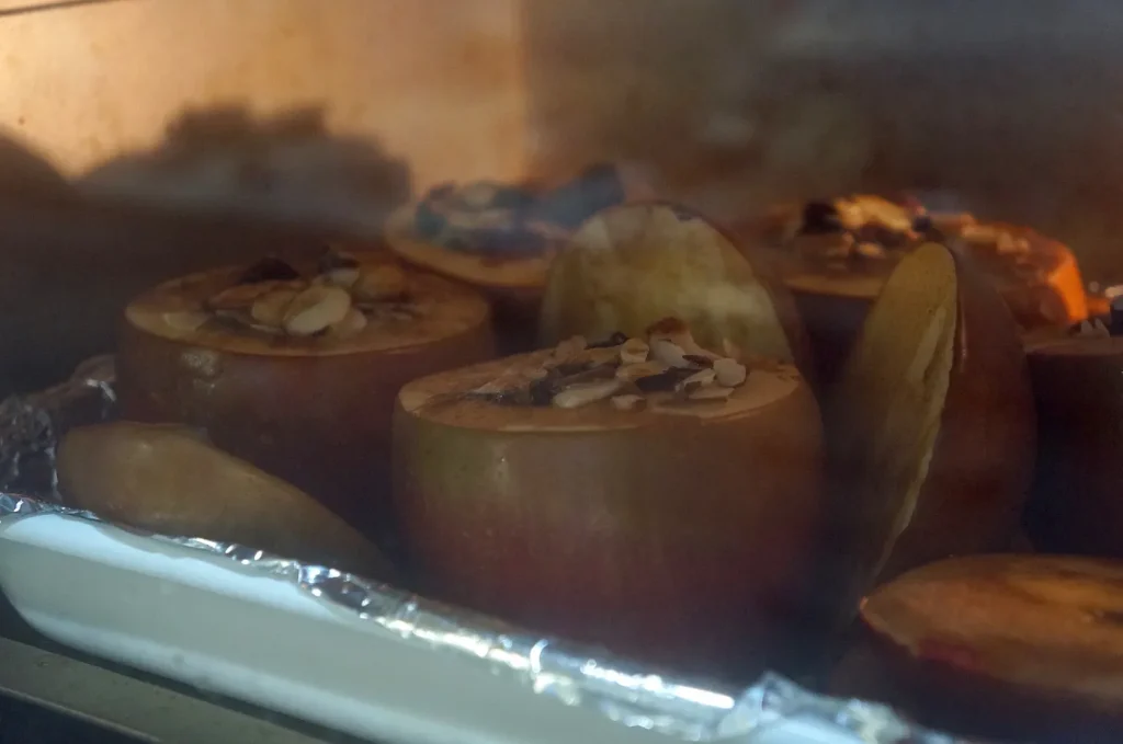 這樣的一本書,適合什麼樣的料理呢?蘋果派、反烤蘋果塔、蘋果瑪芬……總覺得就是差了一點什麼的時候,突然想起德國秋冬美食與聖誕佳餚代表「Bratapfel」,這道菜可甜可鹹,做法簡單,還能保留蘋果的完整樣貌,不需要任何麵糰的襯托,而且放入烤箱烘烤的時候,滿室芬芳,瀰漫著香料的氣息,像是再過一次聖誕節,真是寒冬中最完美的點心了!