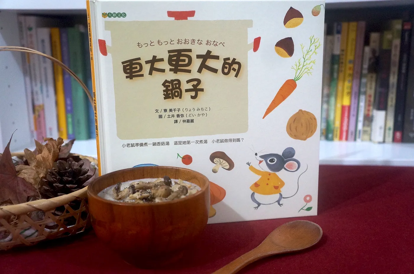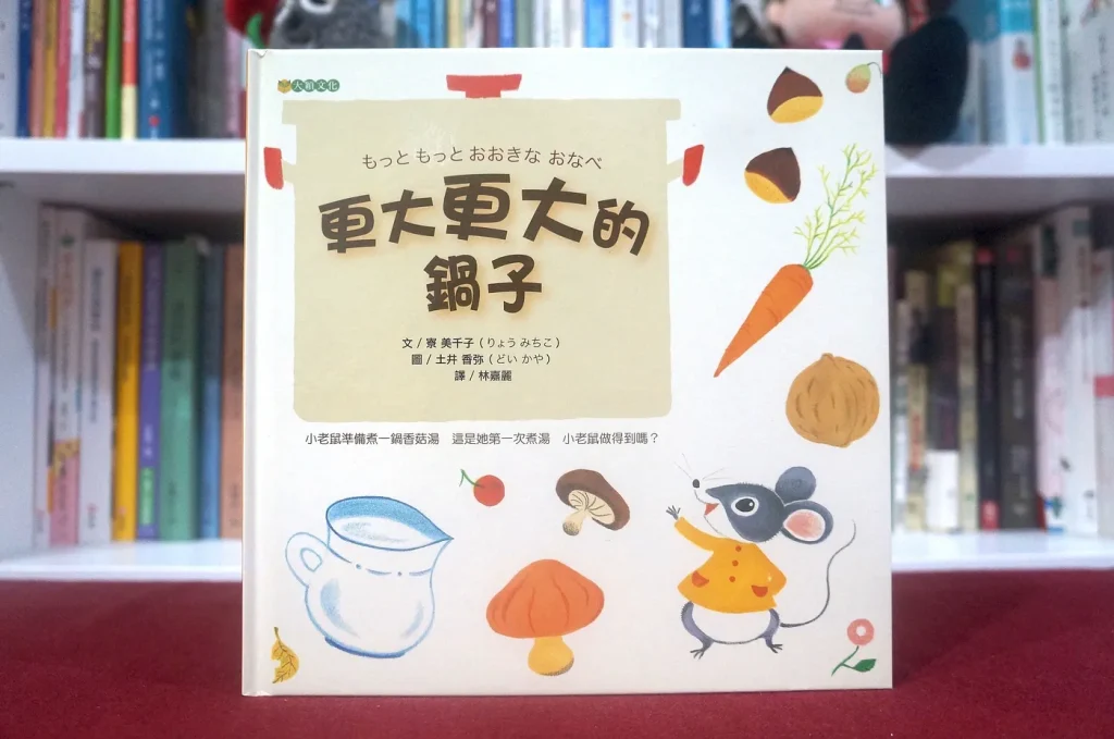 《更大更大的鍋子》是以前籌備「湯主題」繪本讀書會時認識的作品,故事的內容非常簡單,一隻小老鼠趁涼涼的秋天出門,牠摘了滿滿一籃香菇,想來煮濃湯,加了鹽巴覺得太鹹、加了水又太淡,不知不覺湯鍋已經快滿出來了,只好去找朋友幫忙。