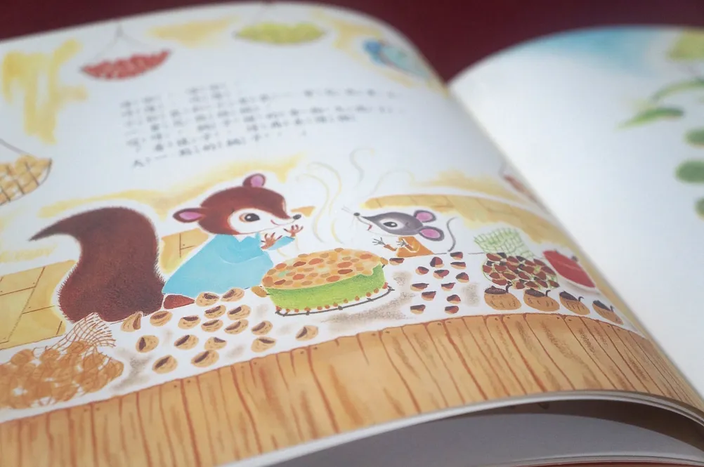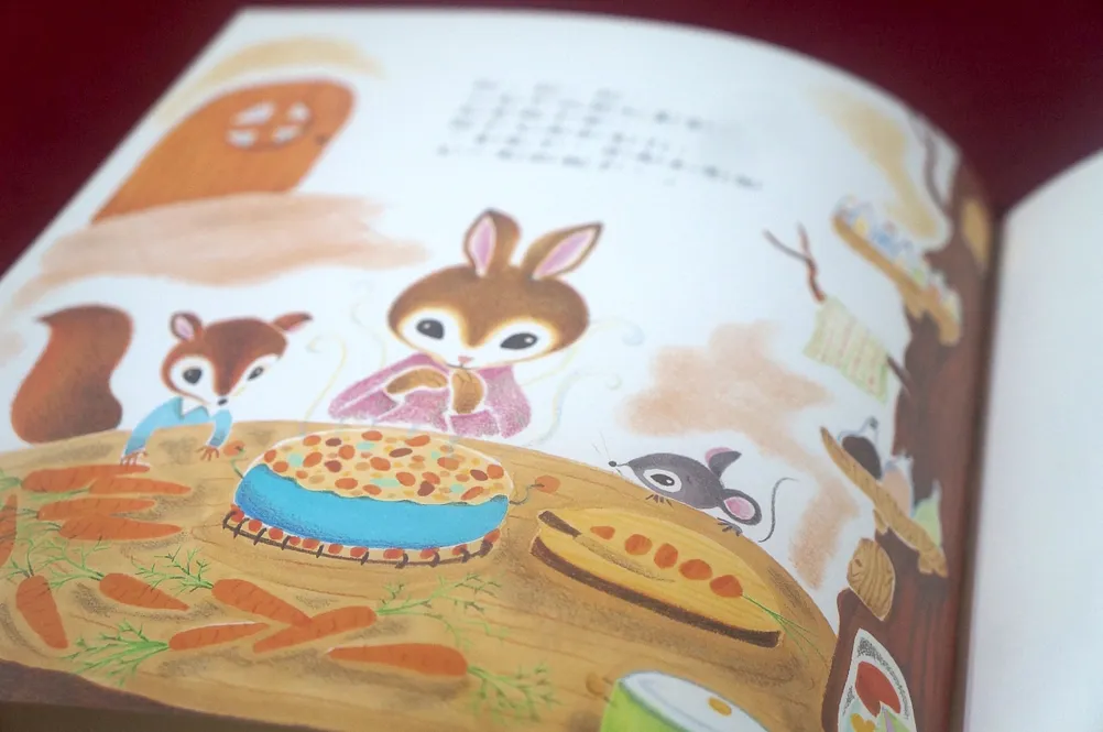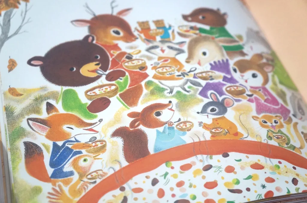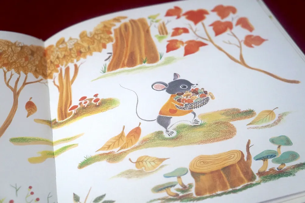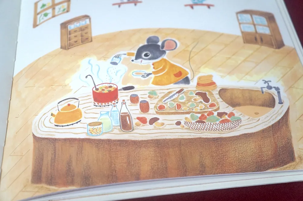 故事雖然很簡短,但畫面值得細細品味,全書以大地色調為主,展現濃厚的秋日氣息,再仔細觀察小老鼠與朋友的家中廚房,每一間的設計都大不相同,小老鼠用的是實木製的中島廚房,上面放著亮麗的紅色小琺瑯鍋與黃色茶壺,櫥櫃裡還有美麗的白瓷餐具組呢!小松鼠用的是橄欖綠色的雙把手鍋,房子裡用網袋儲存許多美味的水果與堅果;小兔子家也有木製廚房和美麗的鍋子,架上還有琳琅滿目的調味料;山羊爺爺將黃色深鍋放在帥氣的黑色壁爐上,家中有許多漂亮的玻璃容器。這些都是閱讀故事時的額外驚喜。