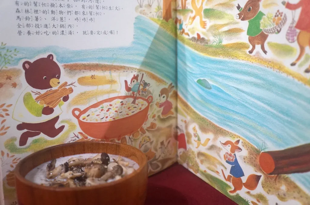 幸好,他們向小熊借來了一個宛如游泳池的超大鍋子,森林裡的動物們合力撿柴、生火,又朝湯鍋裡丟進馬鈴薯與洋蔥,一鍋營養美味、集結眾人之力的濃湯終於完成了。