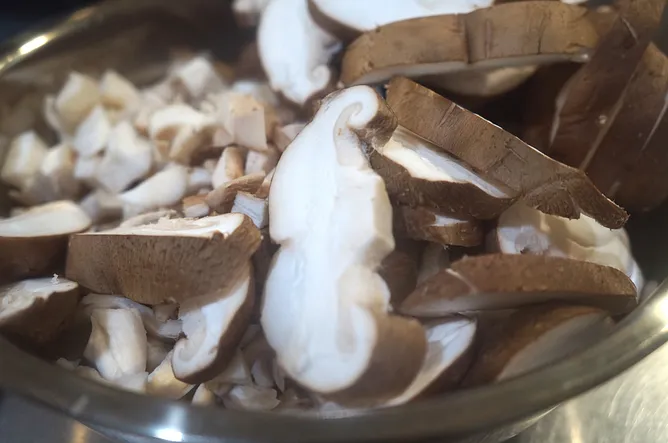 1. 將菇纇清乾淨後切小塊、洋蔥切丁。
