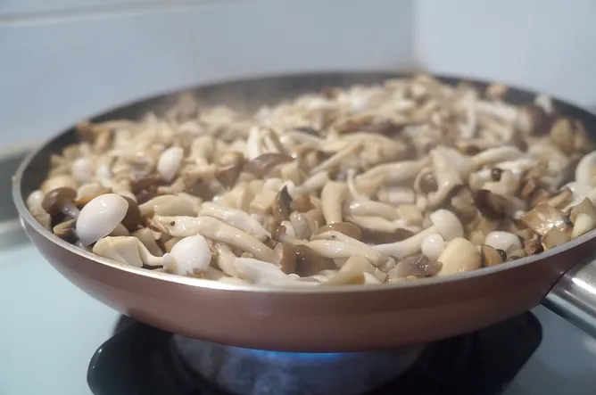 2. 熱鍋放油,大火將菇纇翻炒至出水。