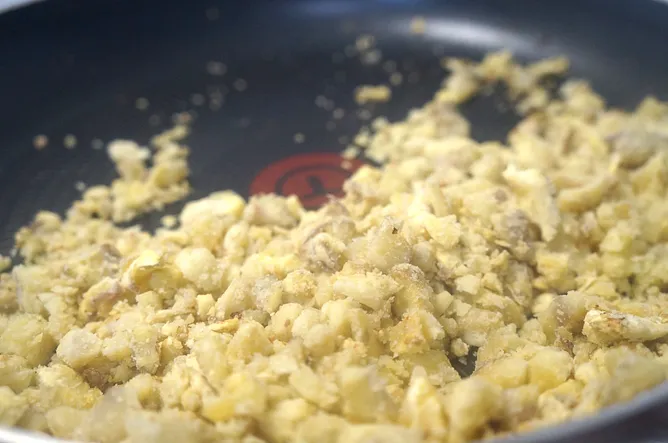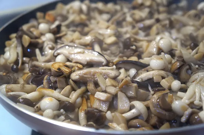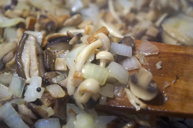 3. 加入洋蔥丁,煸炒至洋蔥變透明,菇纇變成金黃色並散發濃郁香氣。