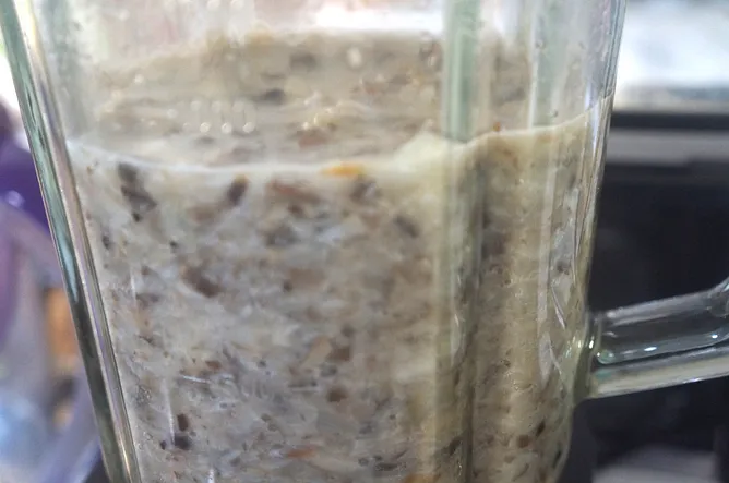 4. 留一碗炒好的蘑菇,其餘的放進果汁機(或食物調理機、均質攪拌棒)。