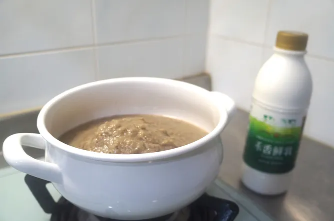 6. 打勻後放入湯鍋裡,加入鮮奶煮到微滾。
