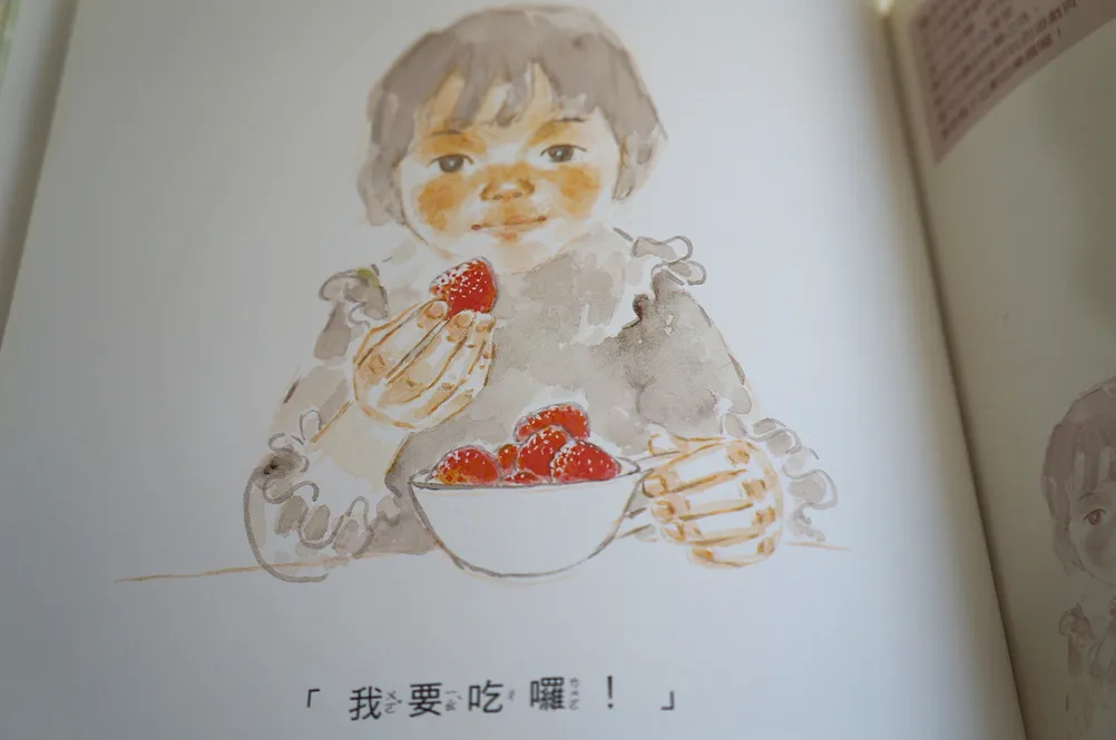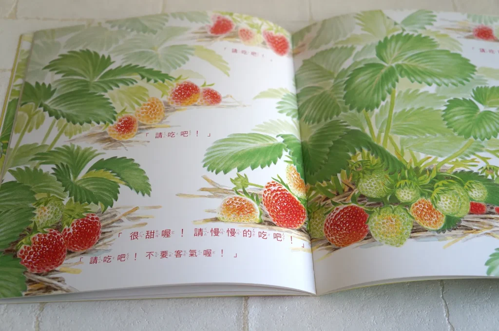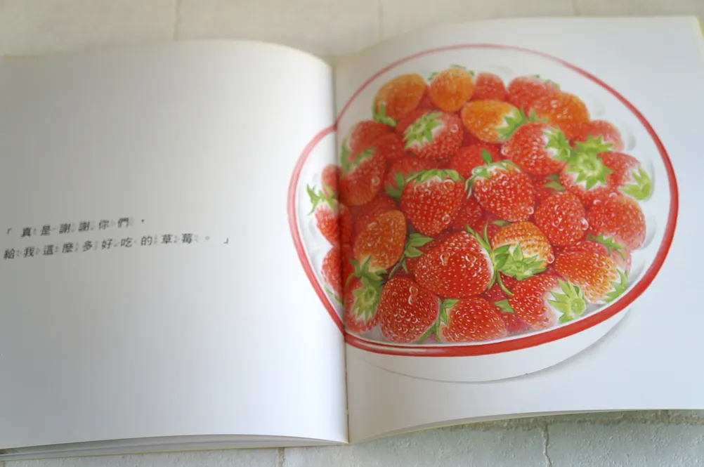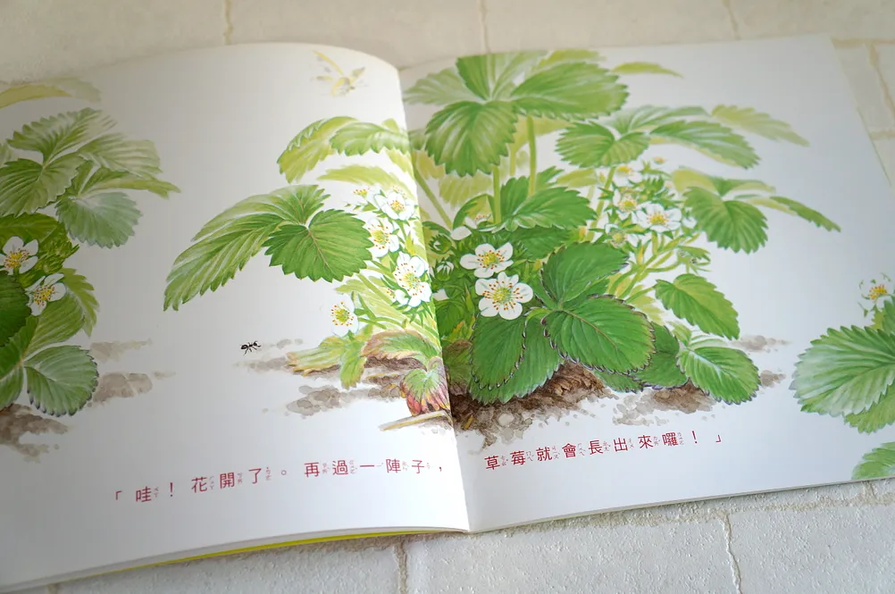 當然只靠書本學習是不夠的,如果能親自體驗,印象一定更深刻!幾年前,我和朋友一起報名了內湖某座農場的一日遊活動,包含親採有機草莓、焢窯午餐、手作草莓大福等行程,一到現場發現幾乎所有報名的人都是年輕的爸媽與小小孩。不知道他們有沒有事先讀過《草莓》這本書,會不會和我一樣,佩服作者的功力,竟然有辦法把草莓的花、葉和假果畫得如此逼真!