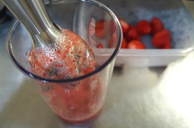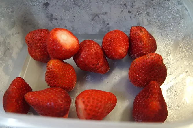 - 天氣冷時可放室溫一天,天氣熱時請改放冰箱兩天,草莓會漸漸出水,請等待至砂糖完全溶解。