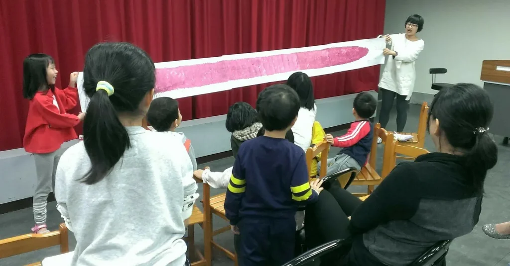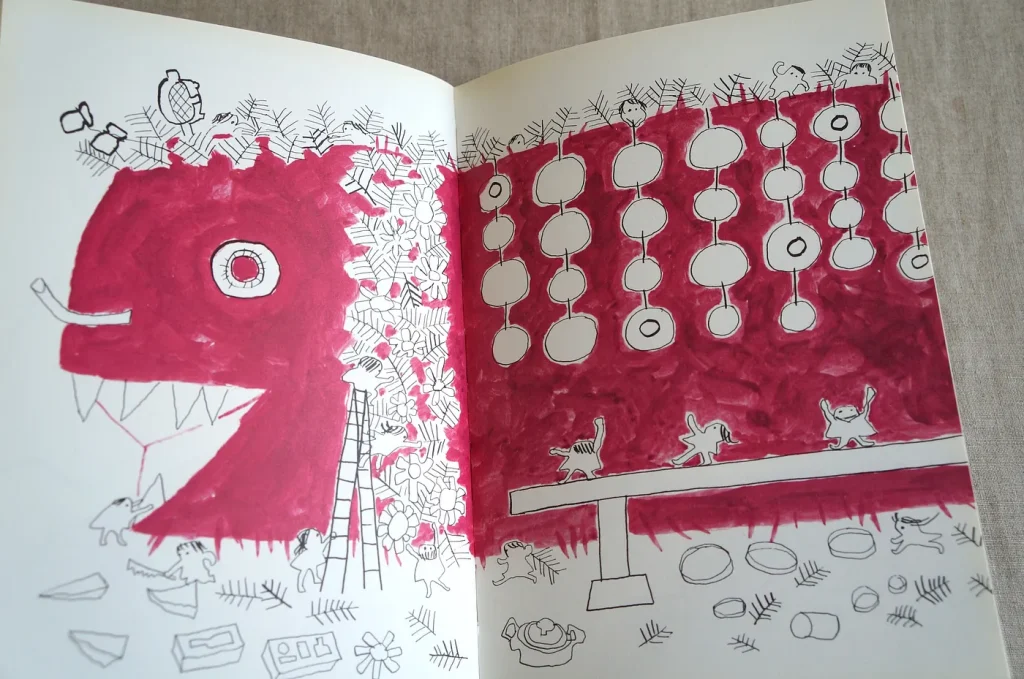 從書名「日本新宿鶴卷幼兒園.市村久子的教育實踐」可以看出,這並非赤羽末吉原創的故事,他從市村老師那兒聽聞孩子們的創作(長500多公分、寬70公分的超大幅作品),成了創作本書的契機,並成功地將孩子們充滿活力的模樣畫入其中,也忠實呈現他們天馬行空、無拘無束的想像。
