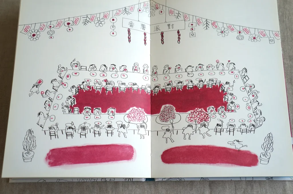 他們拿起紙張與膠水、畫筆和顏料,開始動工啦!跨頁裡盡是滿滿的紫紅色,再下一頁,還是紫紅色,再下一頁,也是紫紅色,那再下一頁呢?哇!竟然還是……長達十四頁的連續畫面,一條超級巨無霸大番薯浮現在眼前。