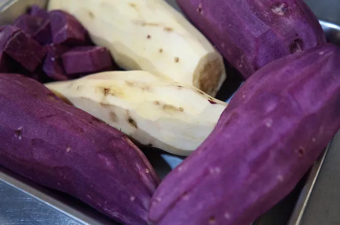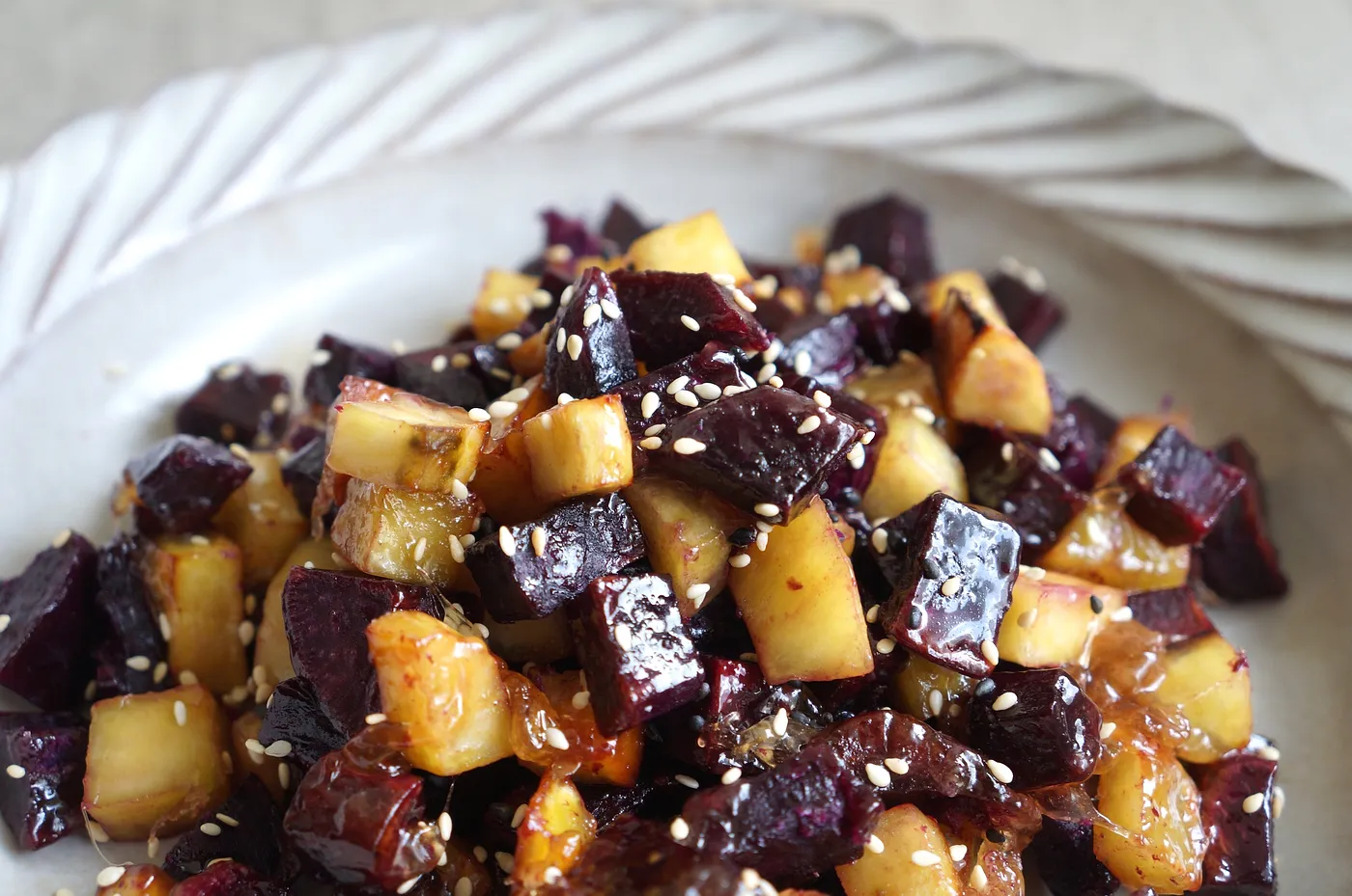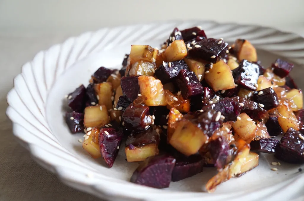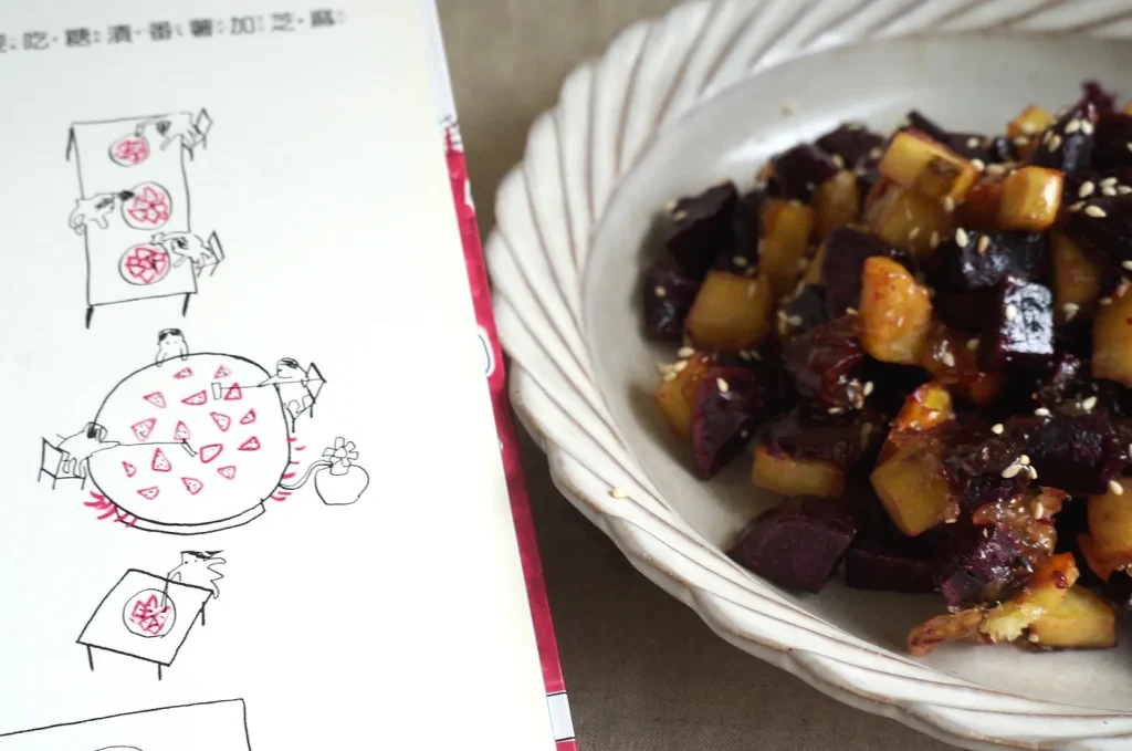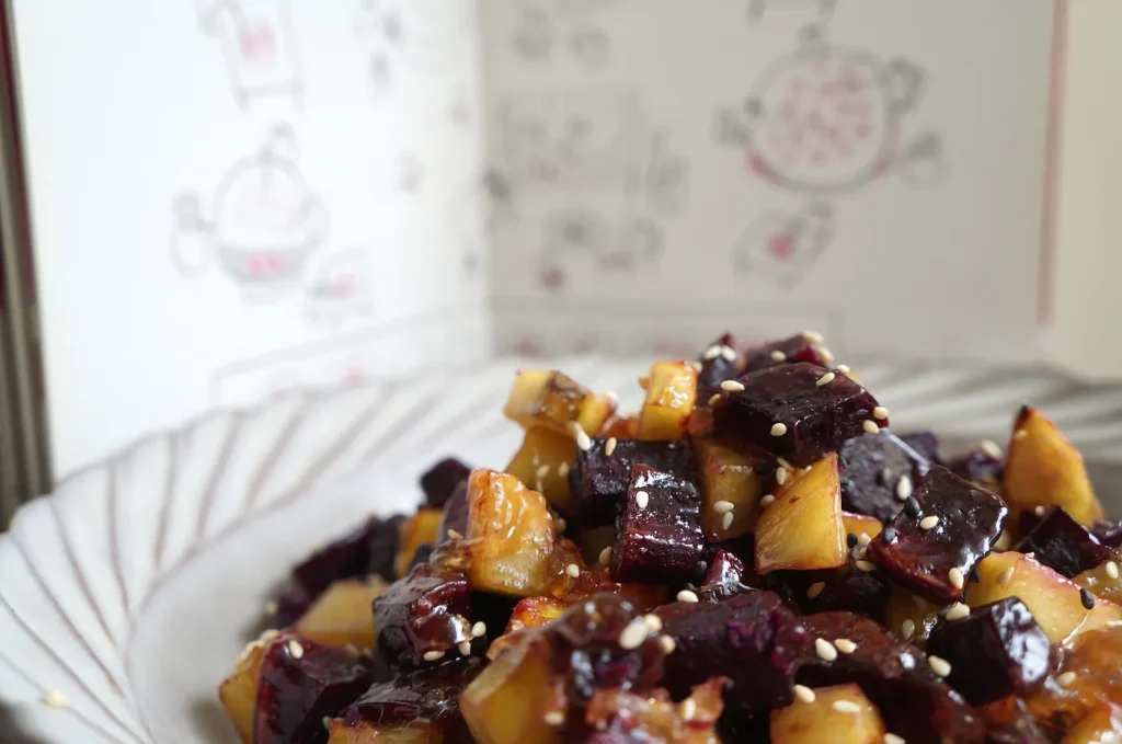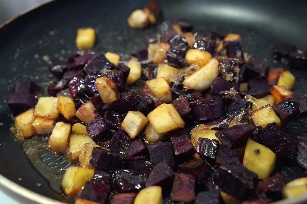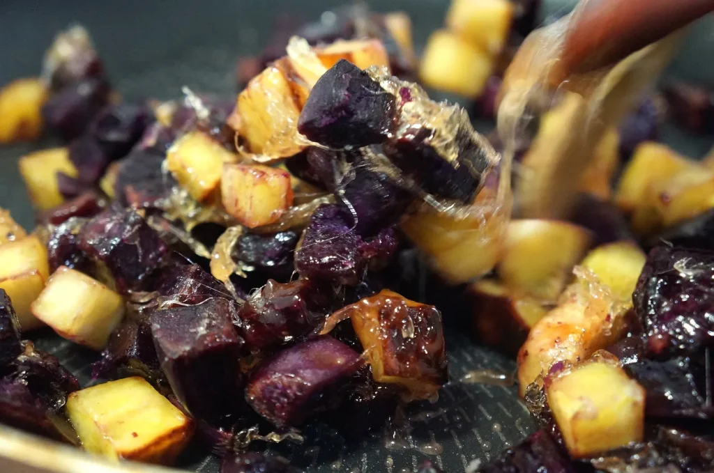 - 地瓜削皮切塊,下油炒至內裡鬆軟、外皮酥脆,呈起備用。