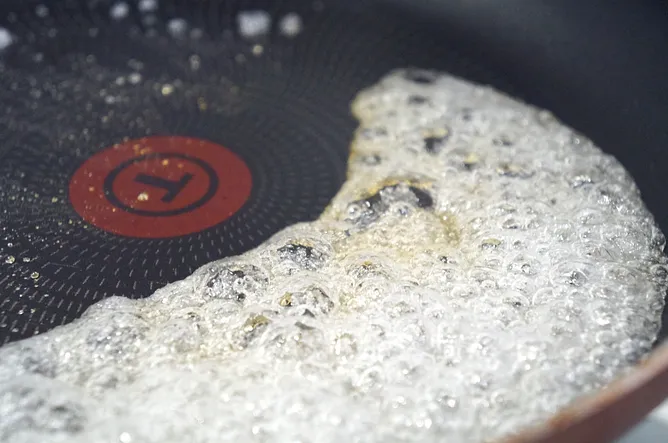 - 把平底鍋洗乾淨、擦乾,加入糖和水,小火加熱,耐心等待糖漿變成淺褐色,倒入薯塊,快速攪拌。