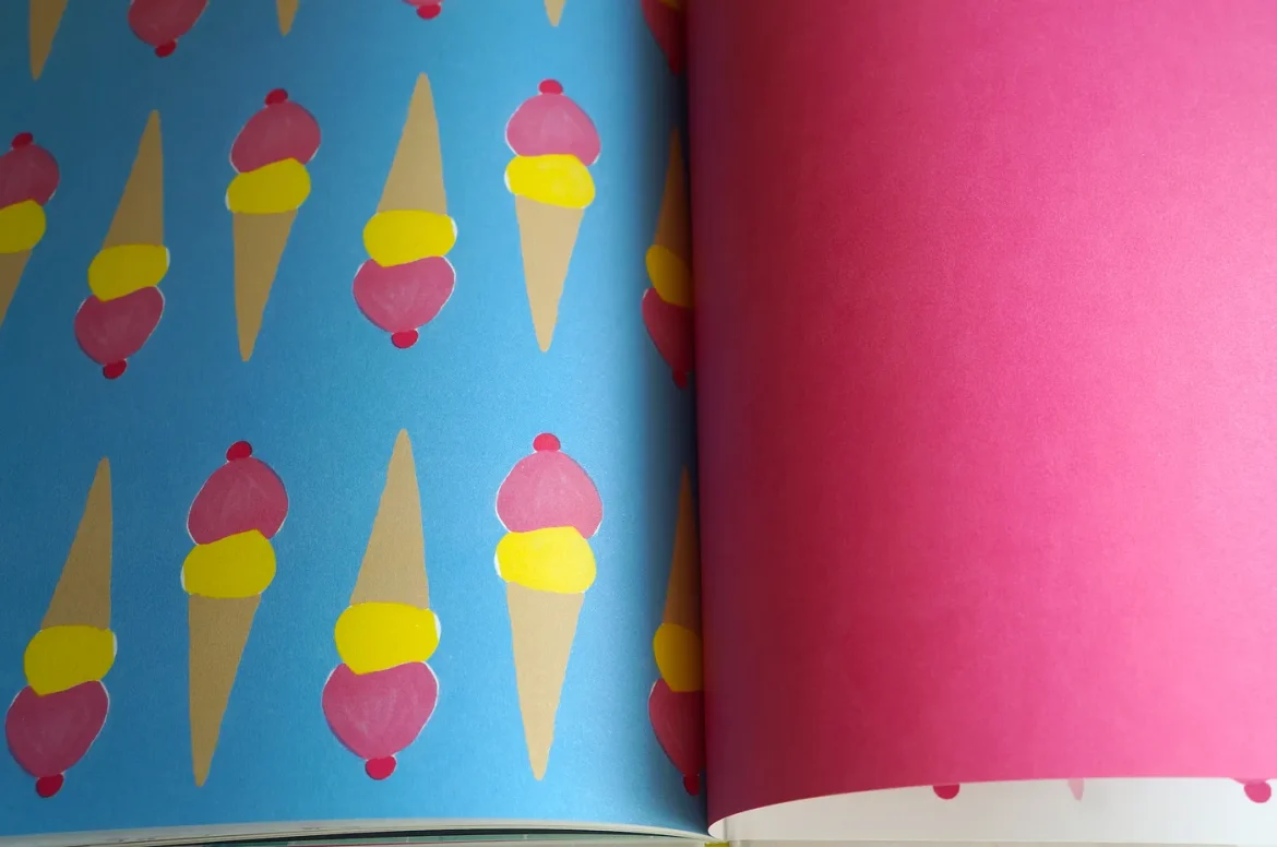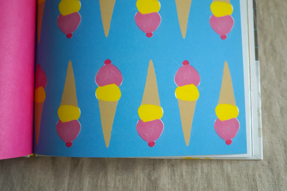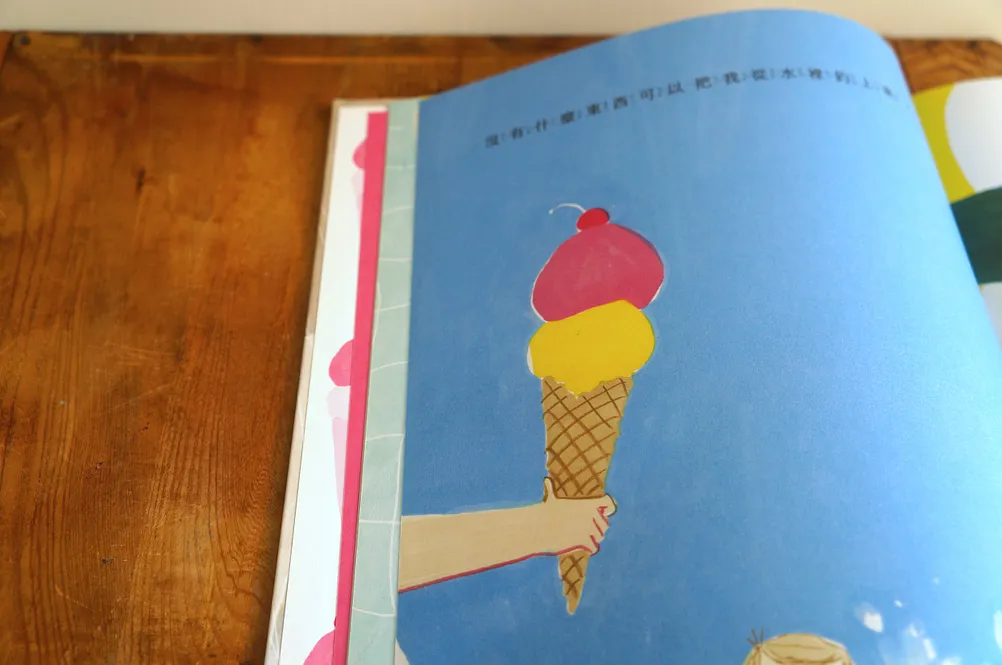 有趣的是,這本書出現了少見的雙重蝴蝶頁,前後都有兩個跨頁的冰淇淋,而冰淇淋上的桃紅色也貫穿全書,出現在男孩的泳褲、泳池的海灘球、條紋上衣、姊姊的髮飾、轉紅的枝頭葉子、沙發靠枕與毯子、狗狗的項圈、冬天的連帽大衣、盛著可可的寬杯子、餅乾的果醬夾心、一家人的圍巾手套與毛帽、雪地裡的雪橇,以及,象徵著即將迎來春天的那朵雪地裡的小花。