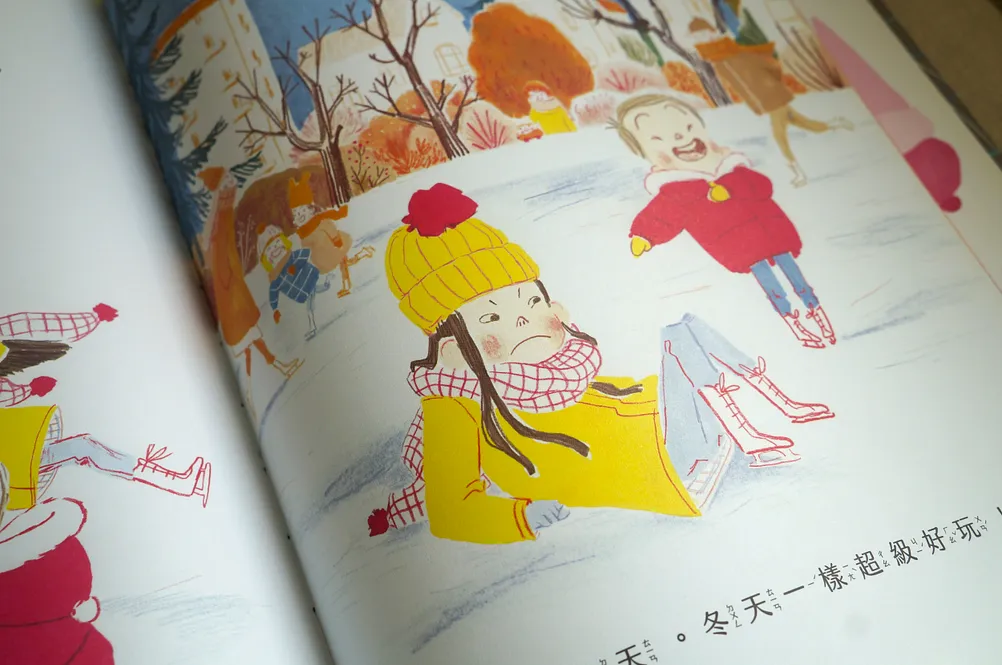 雖然白天變短、夜晚變長,大家都黏在沙發上,雨下個不停,但冬天還是有很多好玩的事,他和姊姊一起踩水窪、喝熱可可配餅乾、在湖上溜冰、玩雪橇、躺在地上做雪天使……要好好把握呢!因為冬天也不會停留太久喔!