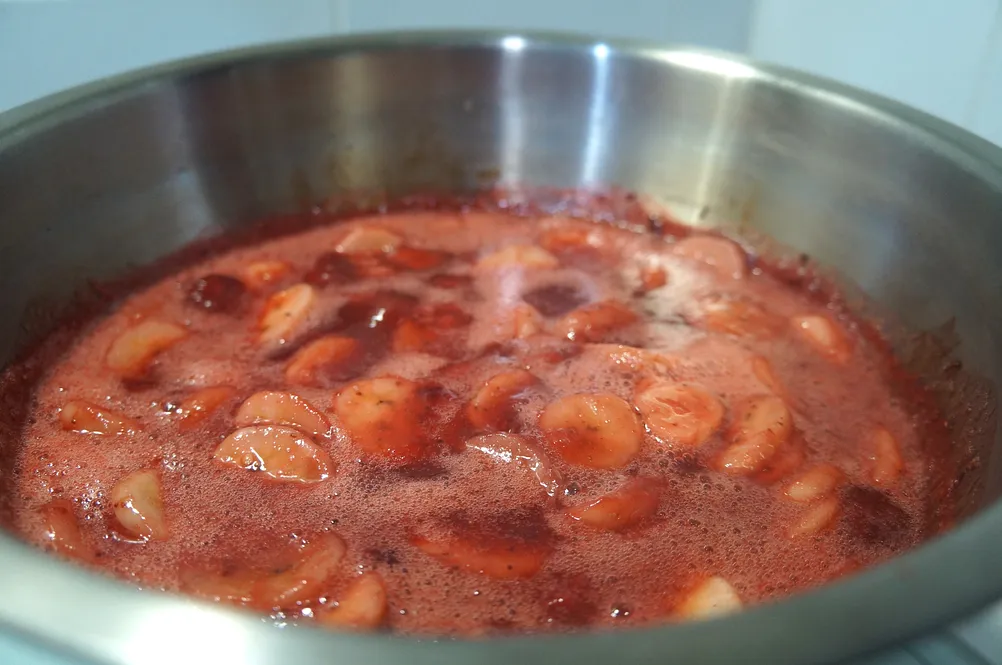 - 將冷凍草莓和香蕉與糖混合,煮成果醬。