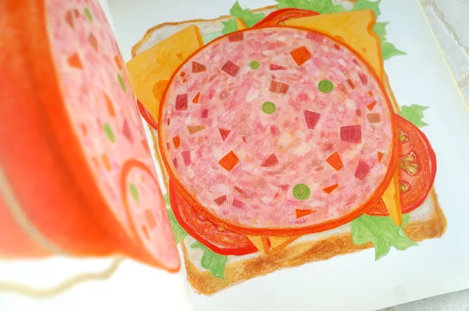 《サンドイッチ サンドイッチ》(三明治 三明治)這本書也是一樣,封面像電影海報一樣,預告了這齣戲的主要演員,接著在內頁裡依序登場,分別是軟綿綿的白吐司、翠綠的生菜、鮮紅欲滴的番茄片、黃澄澄的起司、鹹香的火腿、鮮脆的小黃瓜與水嫩嫩的白煮蛋,一層一層疊上去,三明治完成了,對切之後,就準備開動吧!