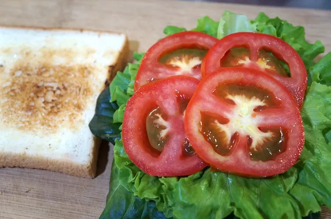 - 在吐司上抹奶油,依序放上生菜、番茄、起司、火腿、白煮蛋、小黃瓜