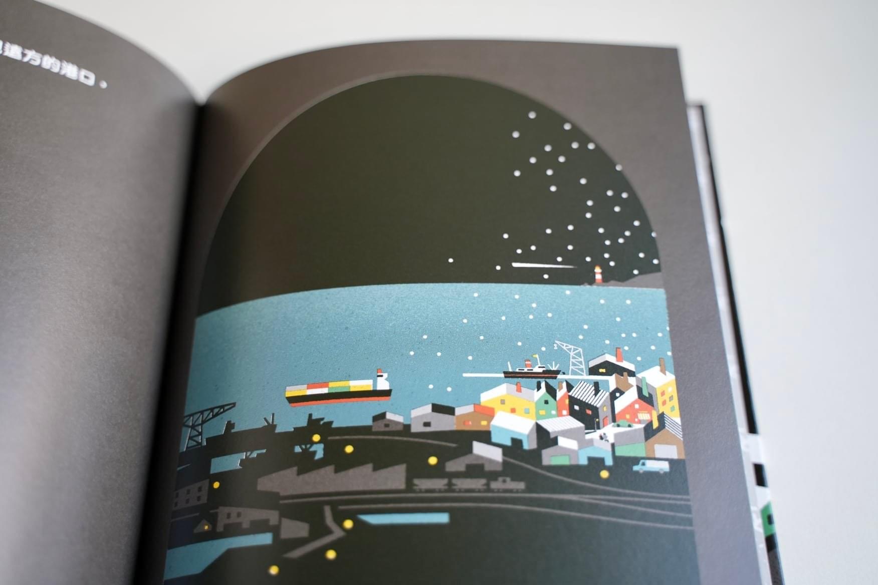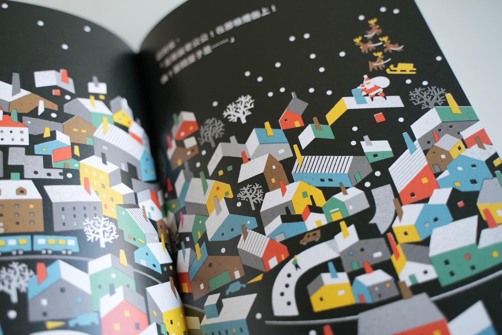 紅色、綠色、金色、銀色……這些都是暮冬時節躍入大家腦中的代表色彩,三浦太郎(みうらたろう)卻一反常態,在這本書中使用了大片大片的黑色作為背景,襯托出輕盈潔淨的白色雪花,並搭配明亮鮮豔的色塊,呈現繽紛多彩的街景。