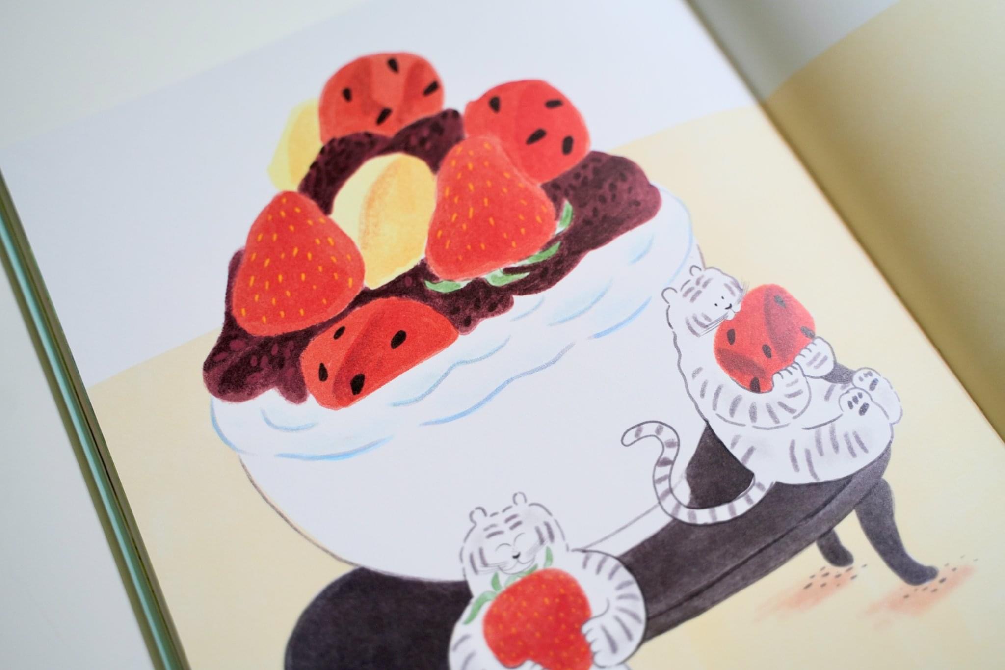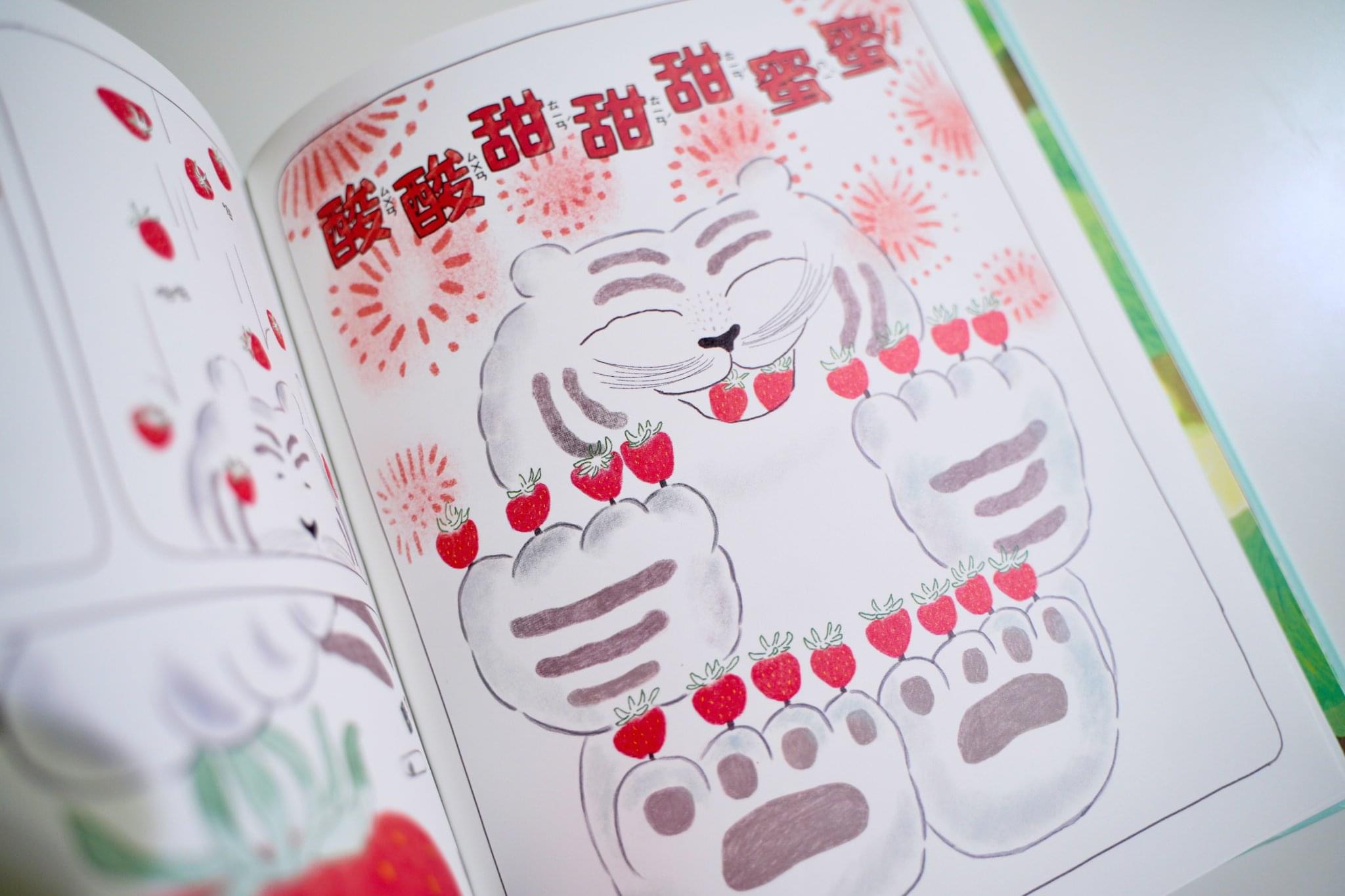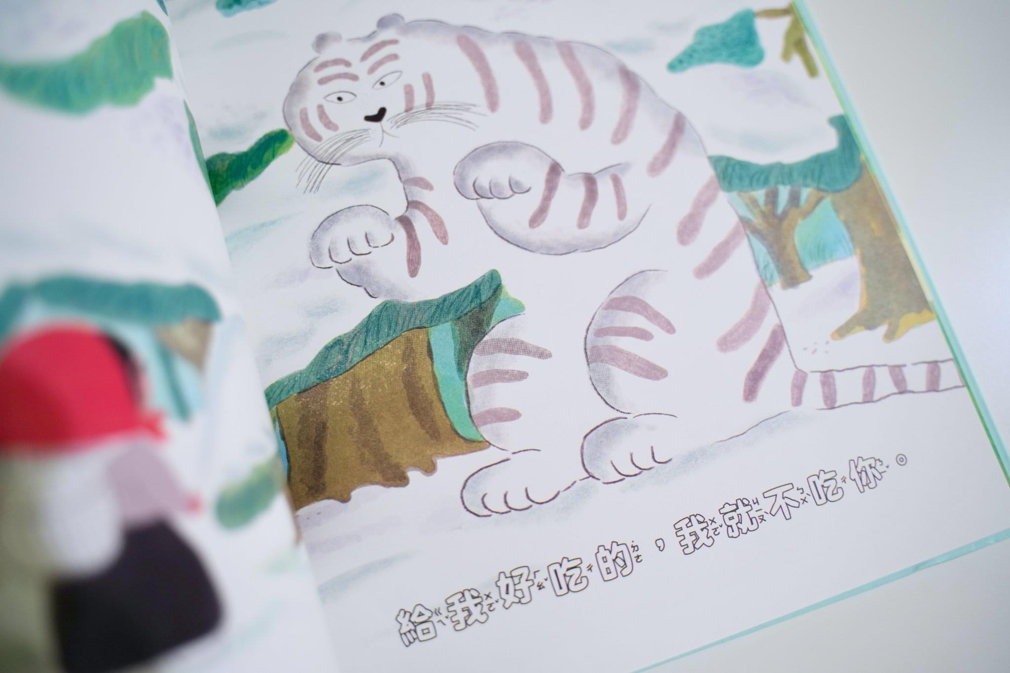 故事從一個綁著紅頭巾、元氣十足的奶奶開始,乍看之下有點像臉上多了皺紋的小紅帽呢!她帶著家裡種的西瓜、甜瓜和草莓,以及一罐熬得甜滋滋的蜜紅豆,要去趕市集了,只是她遇上的不是大野狼,而是一隻白色的大雪虎,聽說只要在溫暖的日子突然下起雪,就會有這樣的怪事出現。