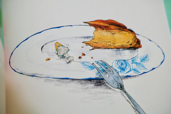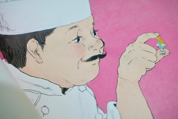 本書的蝴蝶頁就畫出了好多種國王派的迷人造型,紙質也非常用心,和內頁用紙不一樣,特別選用近似包裝甜點用的防油紙。故事描繪被烘焙坊師傅放進派裡的小瓷偶米莉,期待能為別人帶來幸褔,她來到了一戶人家,但是身處派中面看不到外面的世界,只能側耳傾聽著人們的談話,她多希望自己能被屋裡的小女孩貝兒抽到,結果是否能如她所願呢?