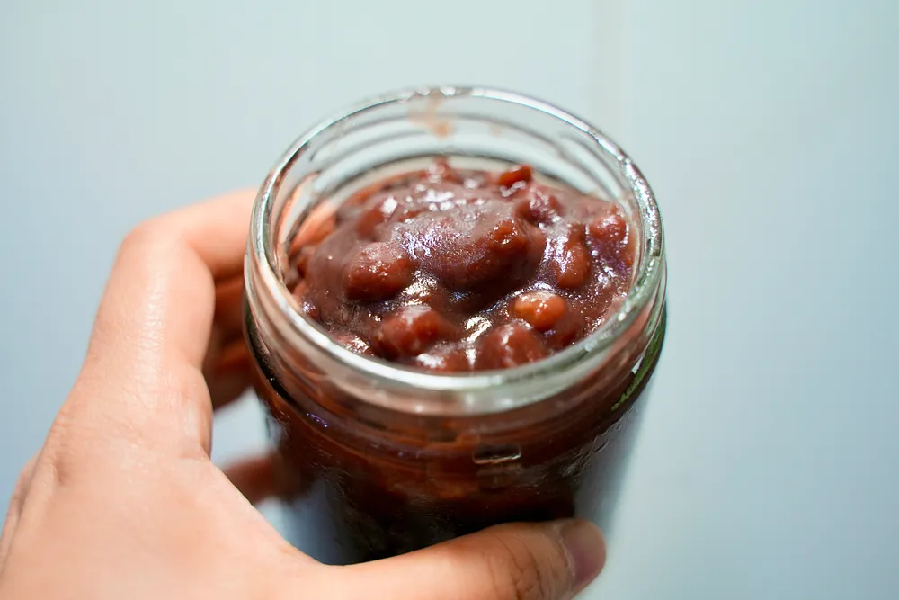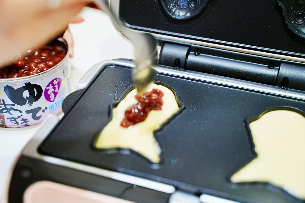 - 撈一匙麵糊於烤盤上,放上適量紅豆餡(可自製,也可到冰品甜湯店、日式點心店購買,或到超市買袋裝或罐頭版的,非常方便),還有布丁(記得要選有雞蛋成份的布丁,若使用俱雞蛋風味但實際上不含蛋的果凍,加熱是會融化的!)