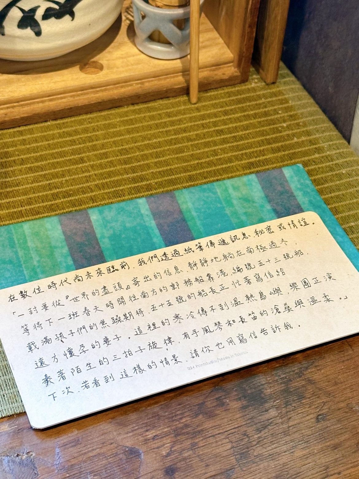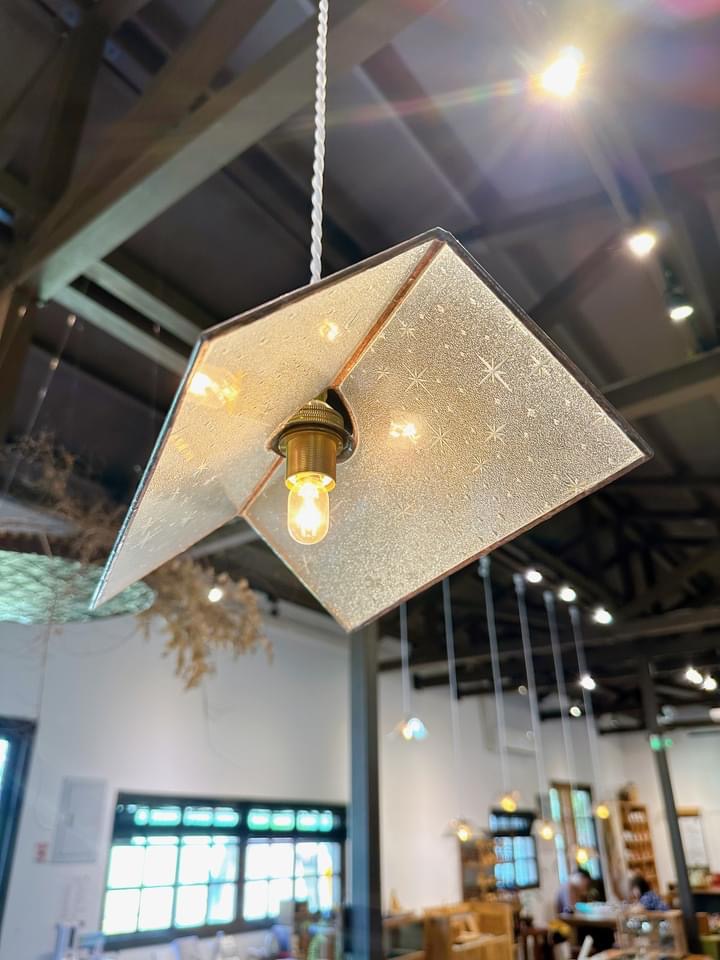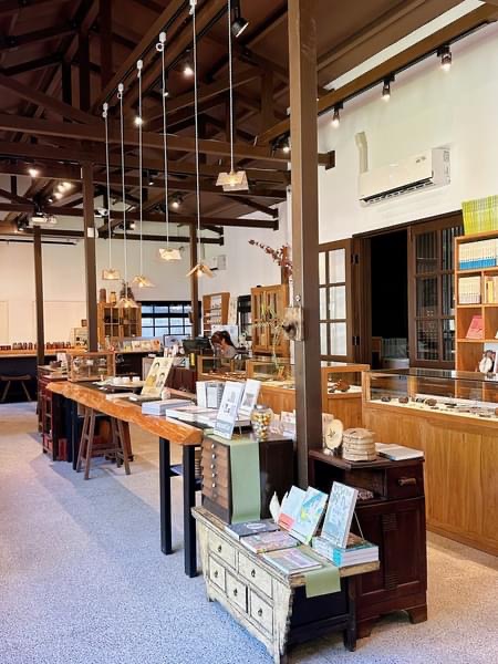 欣賞完大自然的鬼斧神工,慢慢走向「太平山林業鐵路展覽館」後方的小巷子(中正北路124巷),可以走捷徑直接抵達一個清幽的秘密基地——「日光山森林茶書苑」,拉開門之後,撲鼻而來濃郁的木頭香氣,店裡的右側是書店,中間是選物,最左側是茶室,氣氛非常安靜放鬆,可以坐下來好好喝杯茶、休息看書。店裡的復古玻璃吊燈美到不可思議,每一盞的玻璃圖案都不一樣,可以盯著看好久好久。
