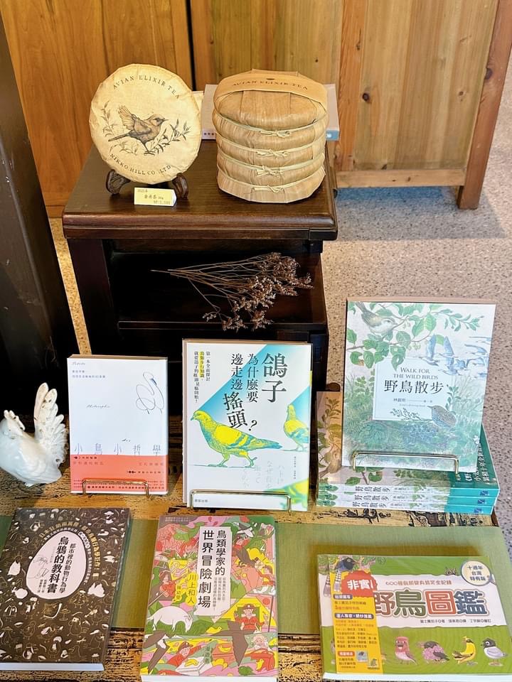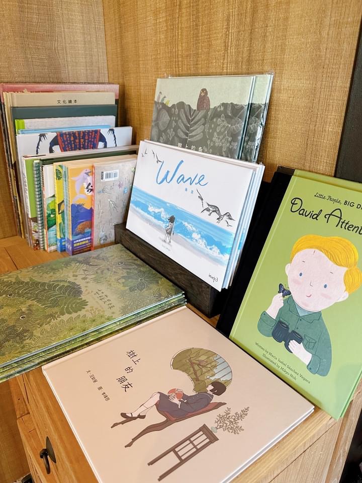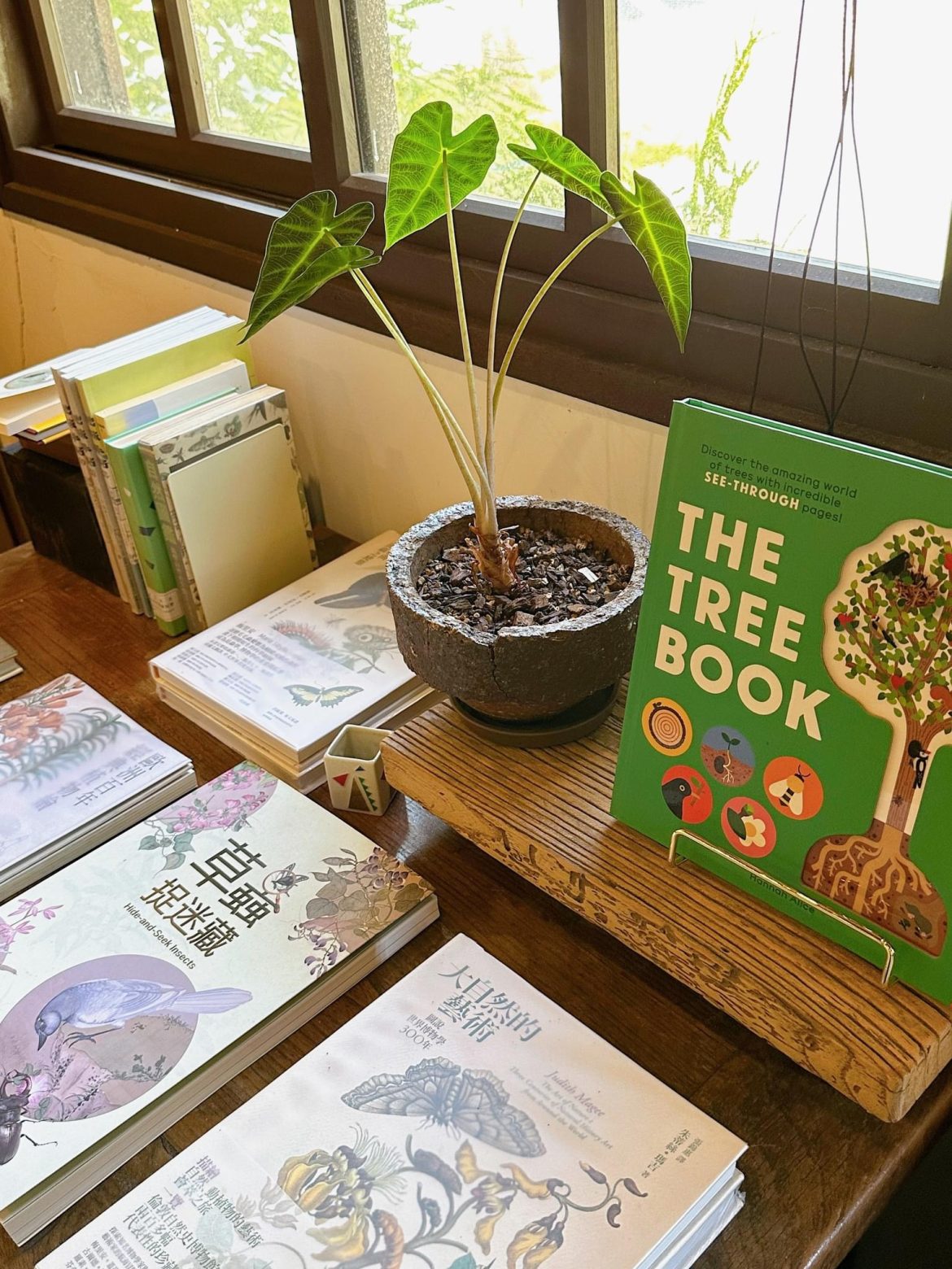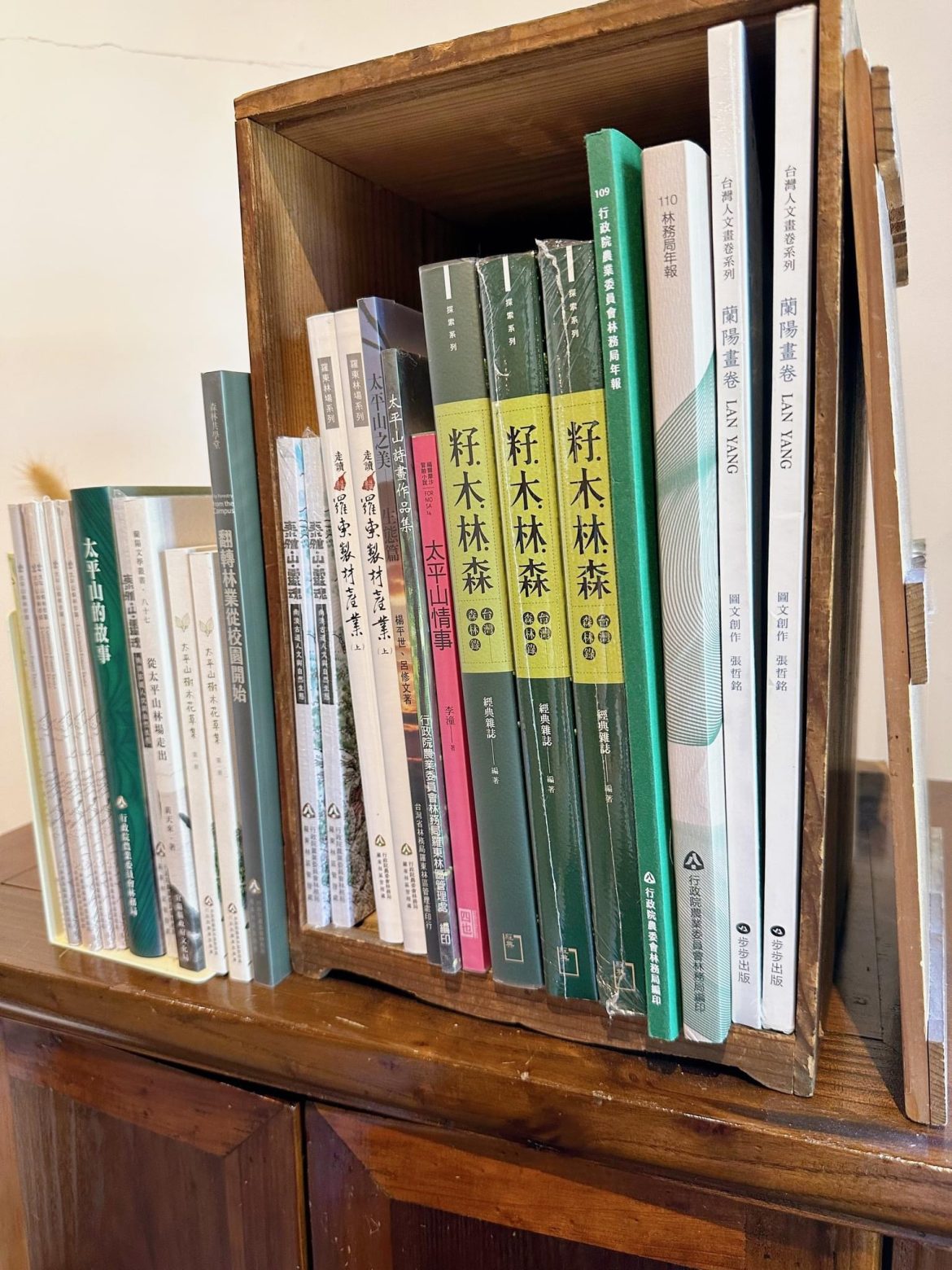 店裡的藏書量沒有很多,可是主題非常明確,看一眼就知道主人的用心,最靠近門口的是幾本「鳥」主題的選書,包含我很喜歡的《都市裡的動物行為學:烏鴉的教科書》;茶具與茶葉附近則有「茶」相關的繪本與知識書;有美麗陽光灑進來的角落放置的是「花草植物」的作品;古董木櫃上是與所在區域息息相關的書籍,像是太平山的故事、林業發展的叢書、蘭陽畫卷等;窗邊木桌則是《跟一行禪師過日常》套書的專屬位置。