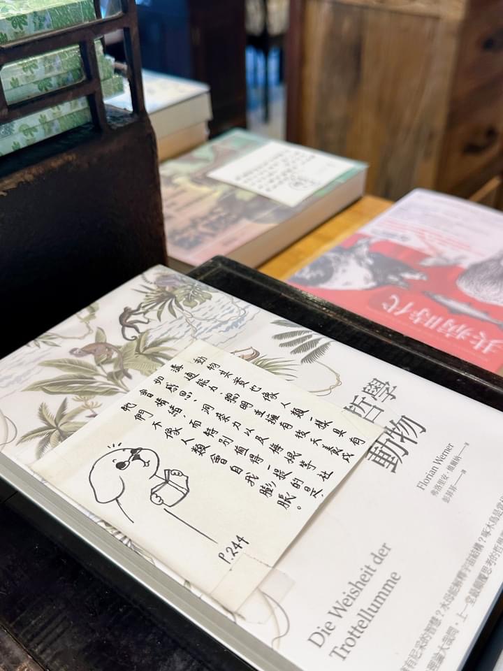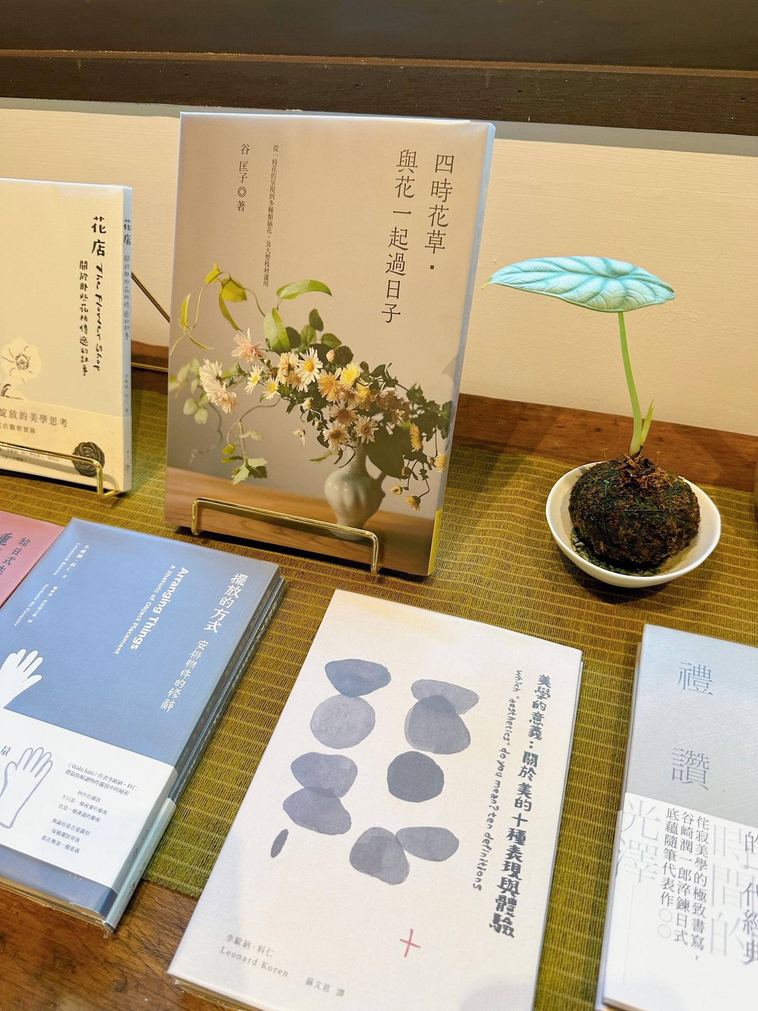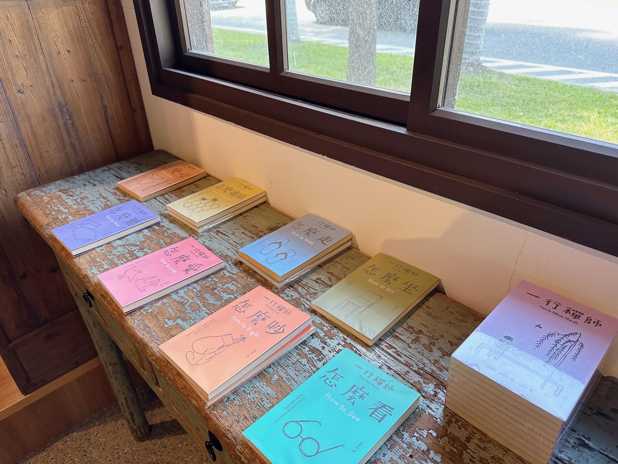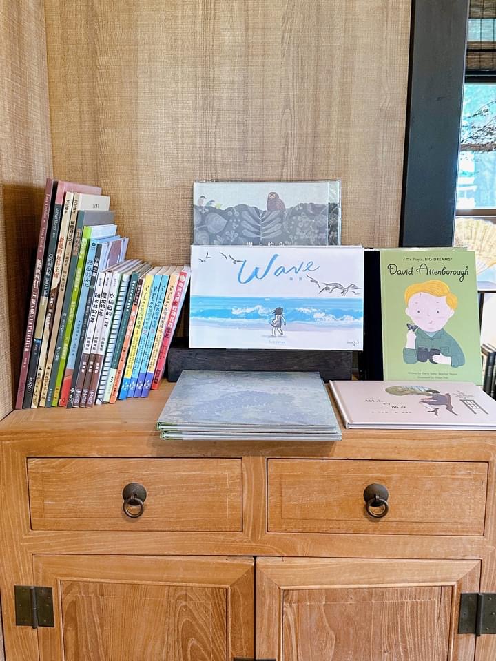 店裡的藏書量沒有很多,可是主題非常明確,看一眼就知道主人的用心,最靠近門口的是幾本「鳥」主題的選書,包含我很喜歡的《都市裡的動物行為學:烏鴉的教科書》;茶具與茶葉附近則有「茶」相關的繪本與知識書;有美麗陽光灑進來的角落放置的是「花草植物」的作品;古董木櫃上是與所在區域息息相關的書籍,像是太平山的故事、林業發展的叢書、蘭陽畫卷等;窗邊木桌則是《跟一行禪師過日常》套書的專屬位置。