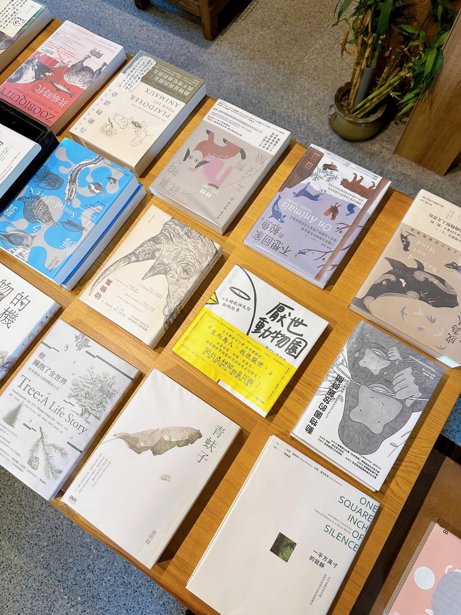 最顯眼的中央平台留給與「大自然」有關的作品,像是植物的歷史、動物的趣味知識、生物的權利等書,不遠處還有一小櫃繪本,每一本幾乎都是討論類似的議題。