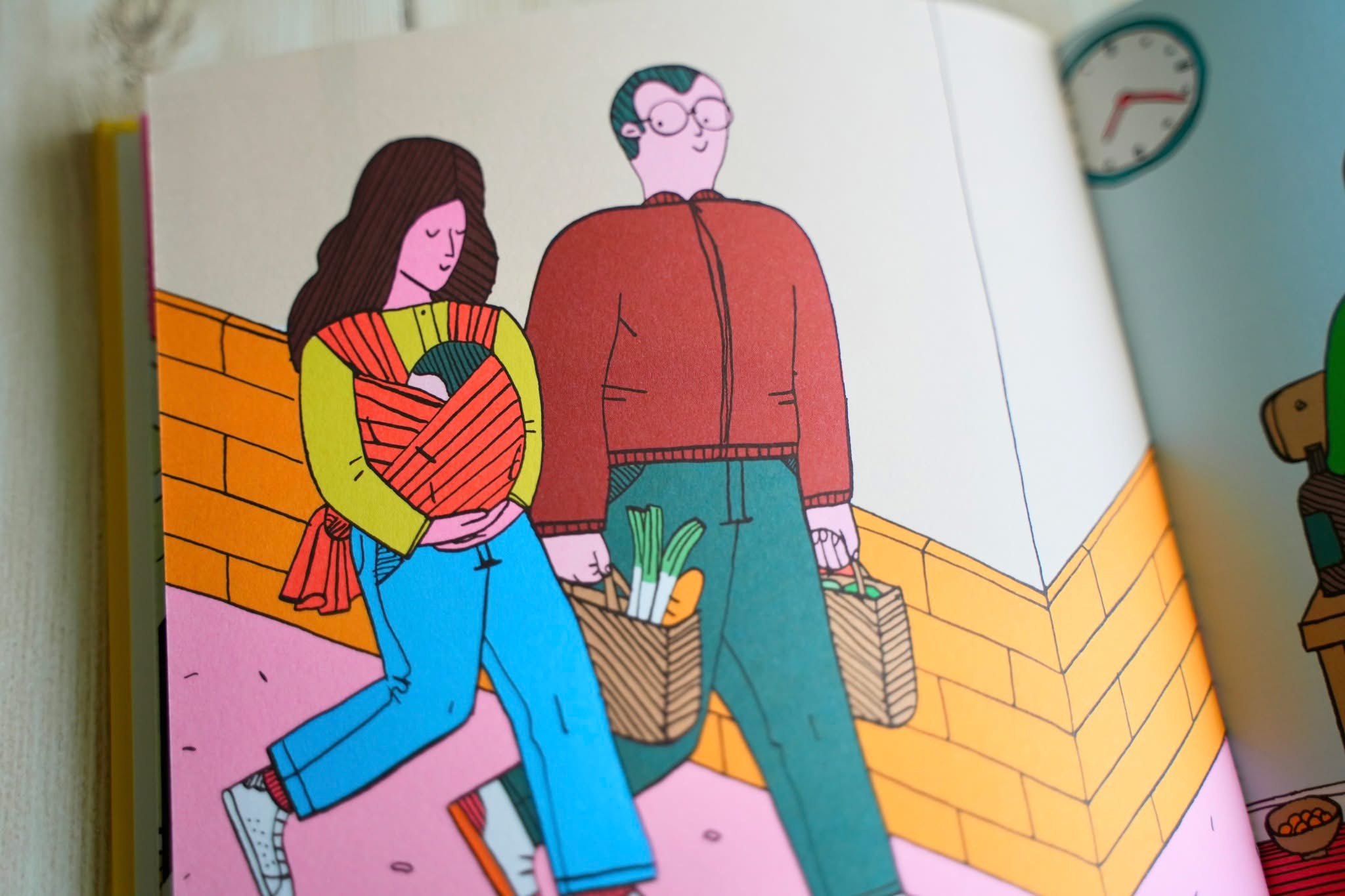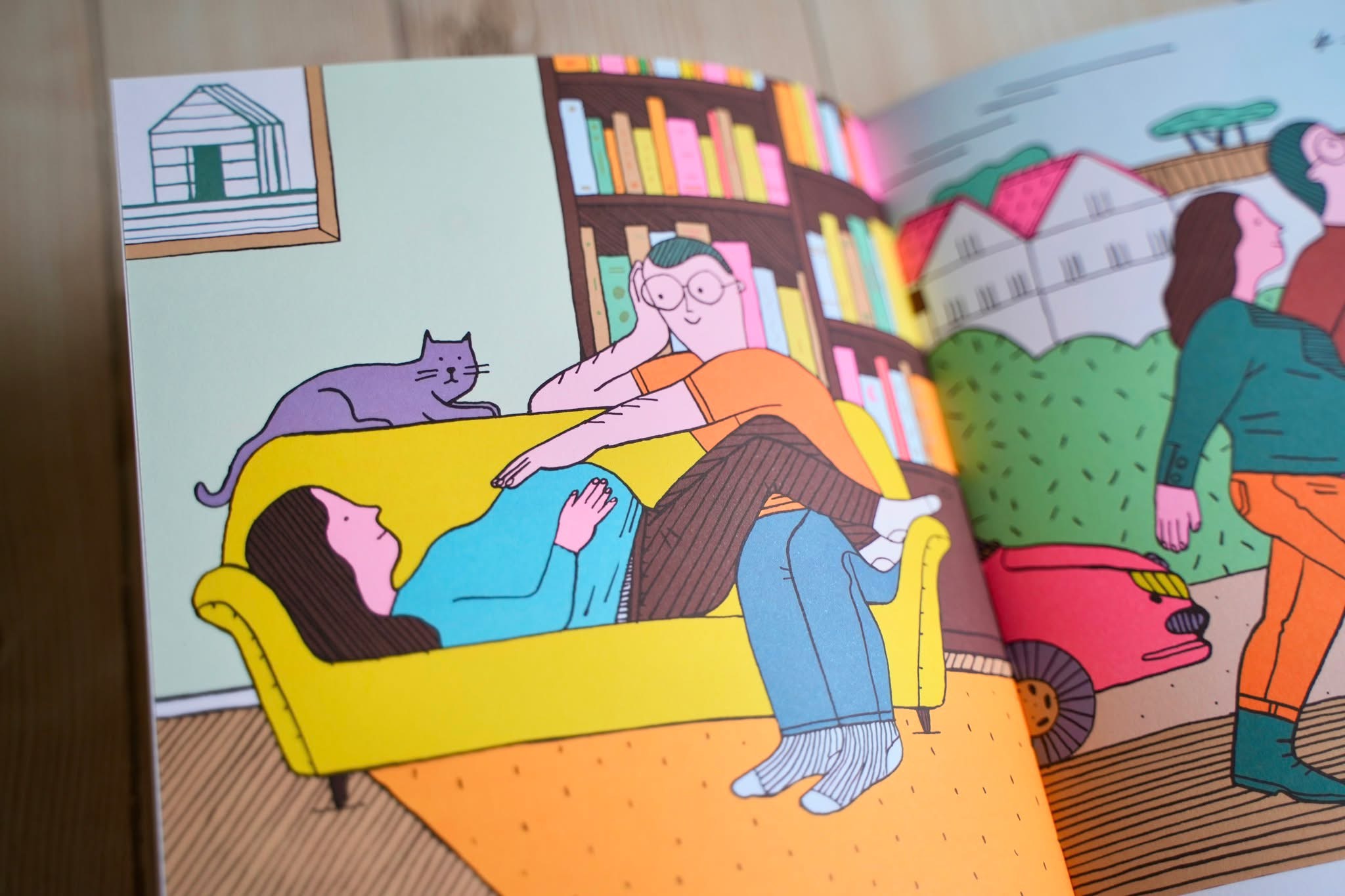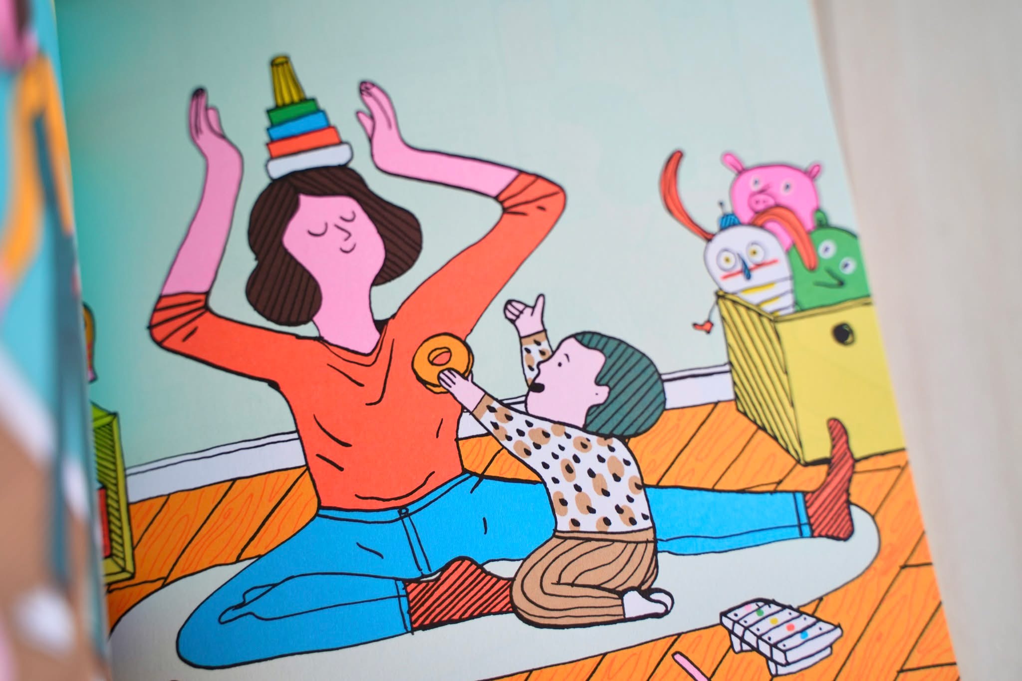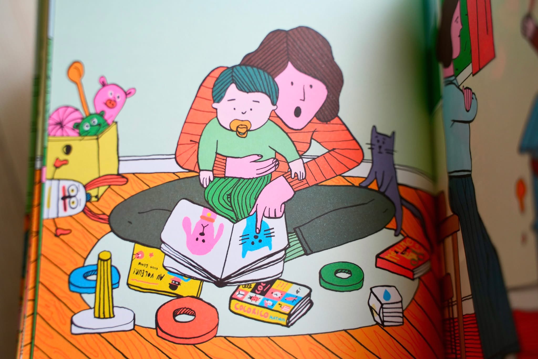 翻開來,即使對荷蘭文一竅不通,仍然一眼就能明白這是一本描繪親子關係、迎接新生命的繪本,明亮鮮豔的用色、現代感十足的俐落線條,看了就心情愉悅,仔細查看版權頁後,發現原來是來自法國的作品,暗暗決定等 7 月前往巴黎旅行時,絕對要帶一本回家!
