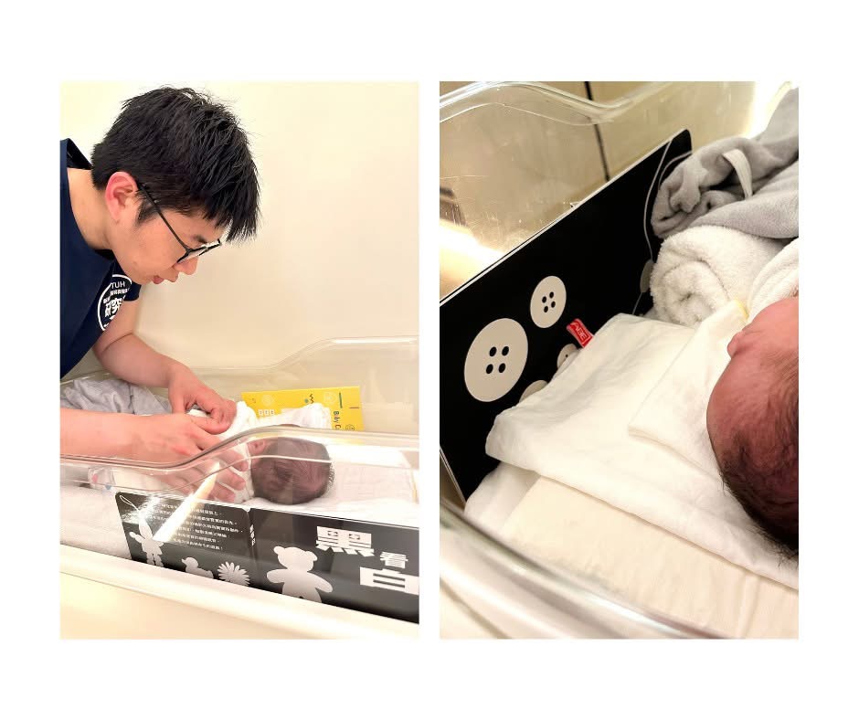 大部分的月子中心,都會在嬰兒床邊擺黑白圖卡。不過,「元氣御守」放的是繪本《黑看白》,每張床都有喔!護理師們每天還會替寶寶換邊擺放及翻頁。這本書是我以前任職出版社的出版品,所以非常熟悉,因為能刺激嬰兒的視覺感官發展,很常推薦或買來送給剛生寶寶的親友。
