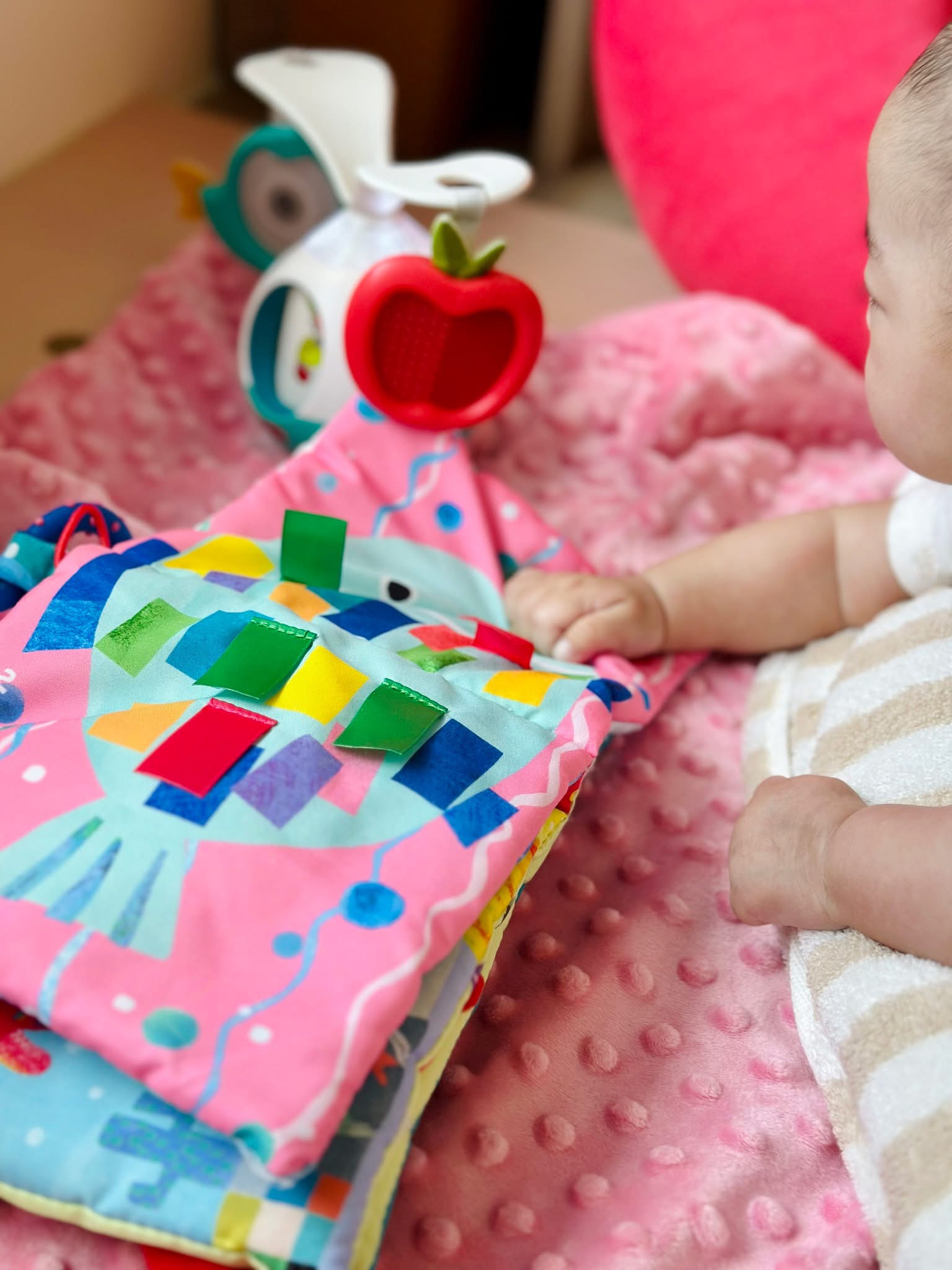 雙手雙腳更是靈活得不得了,安撫巾上的各種小拉繩、緞帶、布球總是百玩不厭,還會自己翻硬頁書或布書。音樂鈴則是從一開始的空中亂踢,變成能夠精準夾住旋轉中的玩具。