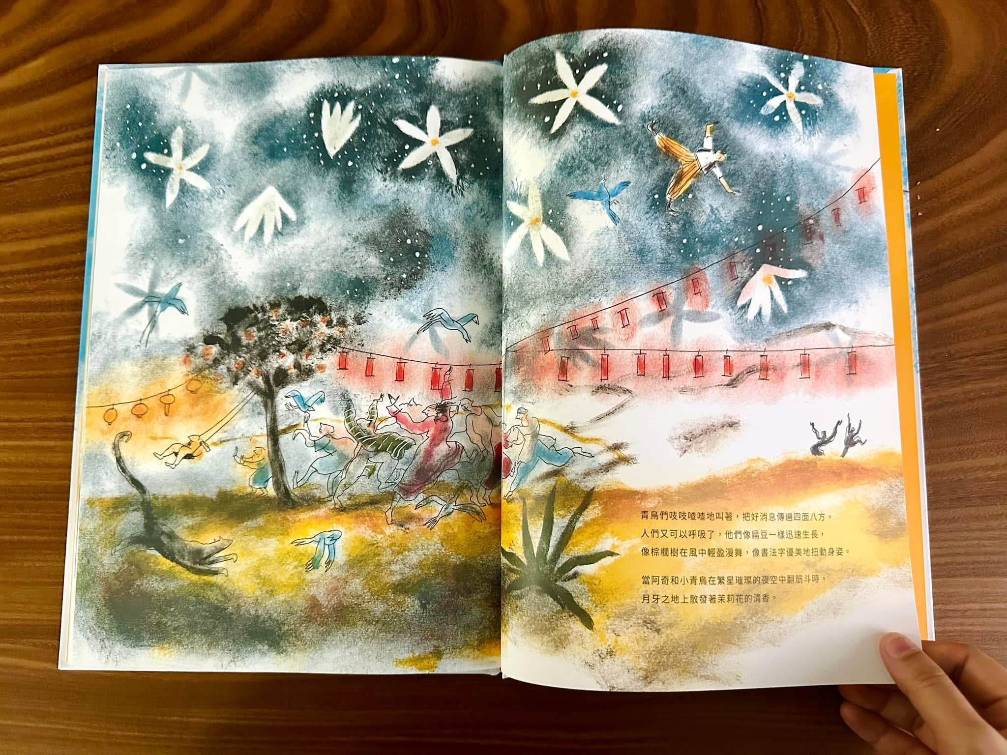 上週日,在台中島知讀市集分享了這個故事(感謝 旅人之森 生活旅行案內所 喬茵慧眼獨具,特別指定這本書),我自己講到最後一頁時,不知為何特別感動,可能是因為這幅跨頁的圖文異常地美,也可能是因為一想到不管是突尼西亞還是台灣,都有許多青鳥們永遠不放棄希望,心緒便如潮水不斷撞擊。
