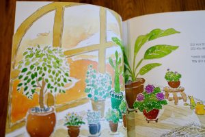 這次一起前往釜山書展的版權同事是個超級綠手指,家裡有好幾個種滿植物的大露台,她甚至在盆栽裡種櫻花!我一看到這本書就想太可愛了,一定給她看看。尤其是龜背芋一登場,我就心動到開始掏錢包啦!(哈哈哈)這本書的主角是一隻大象,故事描繪牠學習種植植物這門高深的藝術。