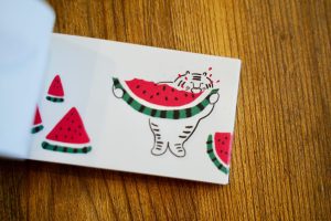 韓國作家李芝殷的迷你動畫小書 1 號,老虎啃完了西瓜之後,會出現什麼畫面呢?一本只要 10 秒就能馬上看完的書,光是拿在手上隨手翻翻也可愛。