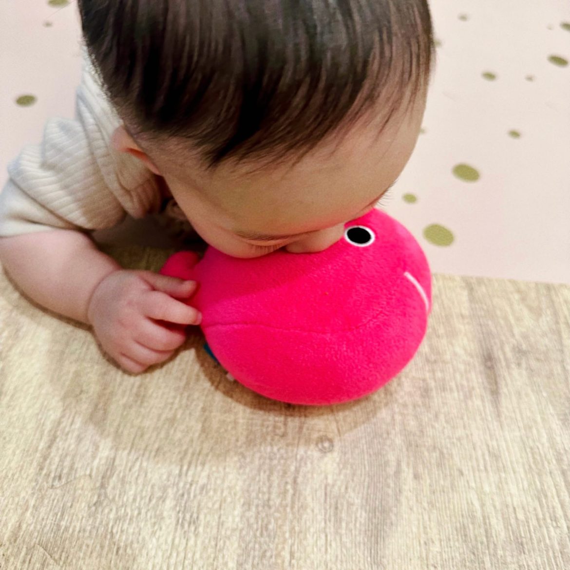 托嬰中心的老師也觀察到,小魚特別喜歡刺激的遊戲,像是舉高高、上下彈跳、抱著轉圈圈或飛機遊戲,總能讓她笑到超興奮,一秒變成「XD 臉」。雖然還不太會爬,但移動能力大幅提升,幾秒鐘就能自己轉方向,或滾或挪地到她想去的地方。