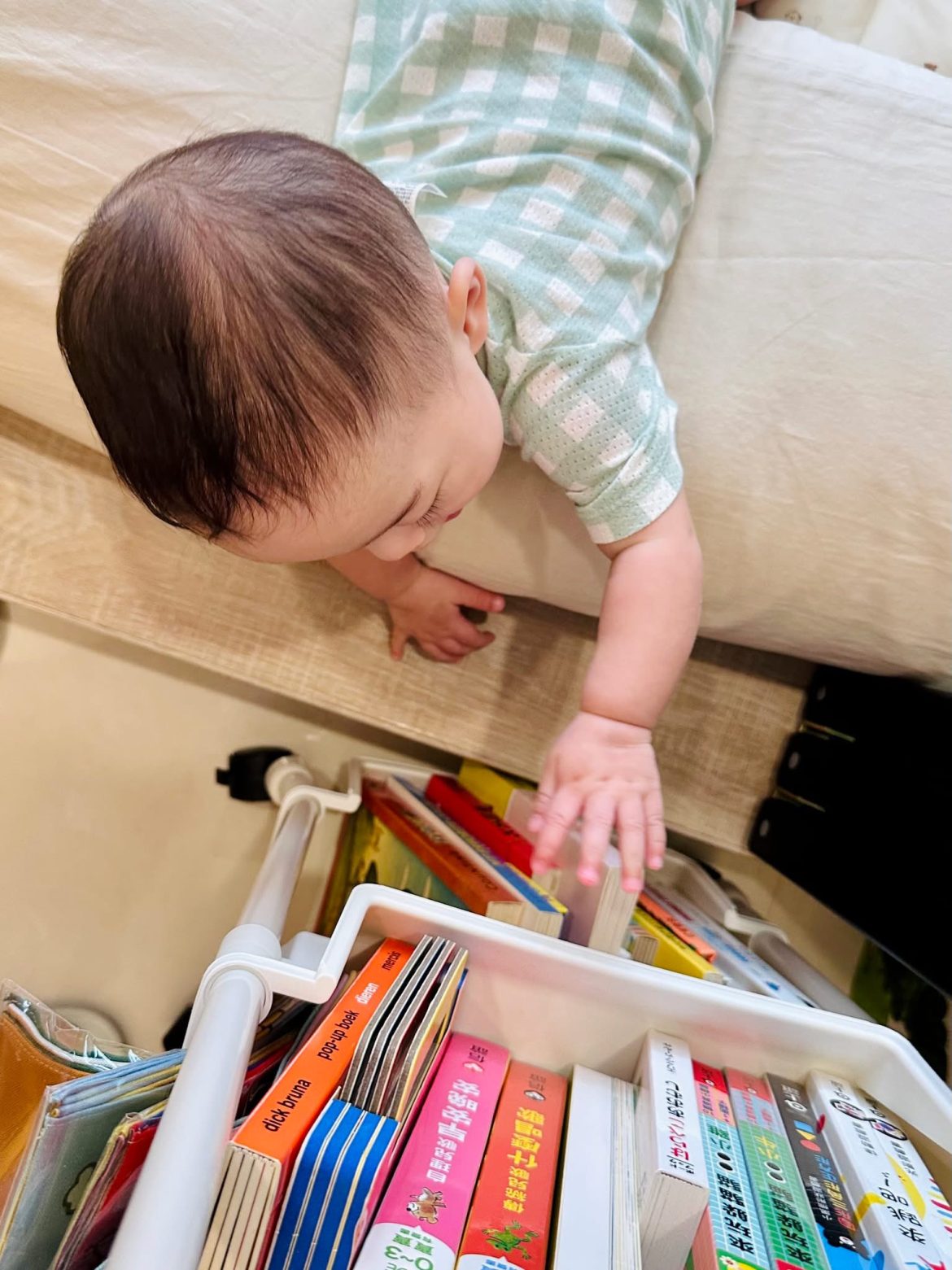 更厲害的是,假期期間她還「解鎖」了爬行技能!從一開始肚子貼地蠕動,到屁股晃呀晃,最後終於能用手腳協調前進。現在,只要她的眼睛盯上某個目標,就能用驚人的速度直奔而去,比如衝向窗台邊,看玻璃裡的倒影,或爬到她的小書櫃前,抓起一本書。