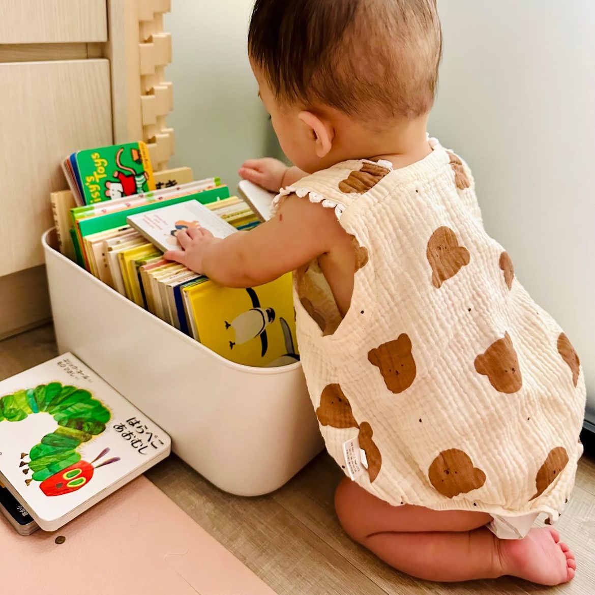 《Maisy’s Little Library》的四冊小套書,還有Helen Oxenbury 的《Baby Love》是我在好多好多年以前就自己買來收藏的迷你小書,她喜歡從無印良品的收納箱裡面自己撈出來啃啃四邊的書角,然後再拋到一邊。媽媽就和她不斷重複拿出來、丟進去、拿出來、丟進去的無限循環。