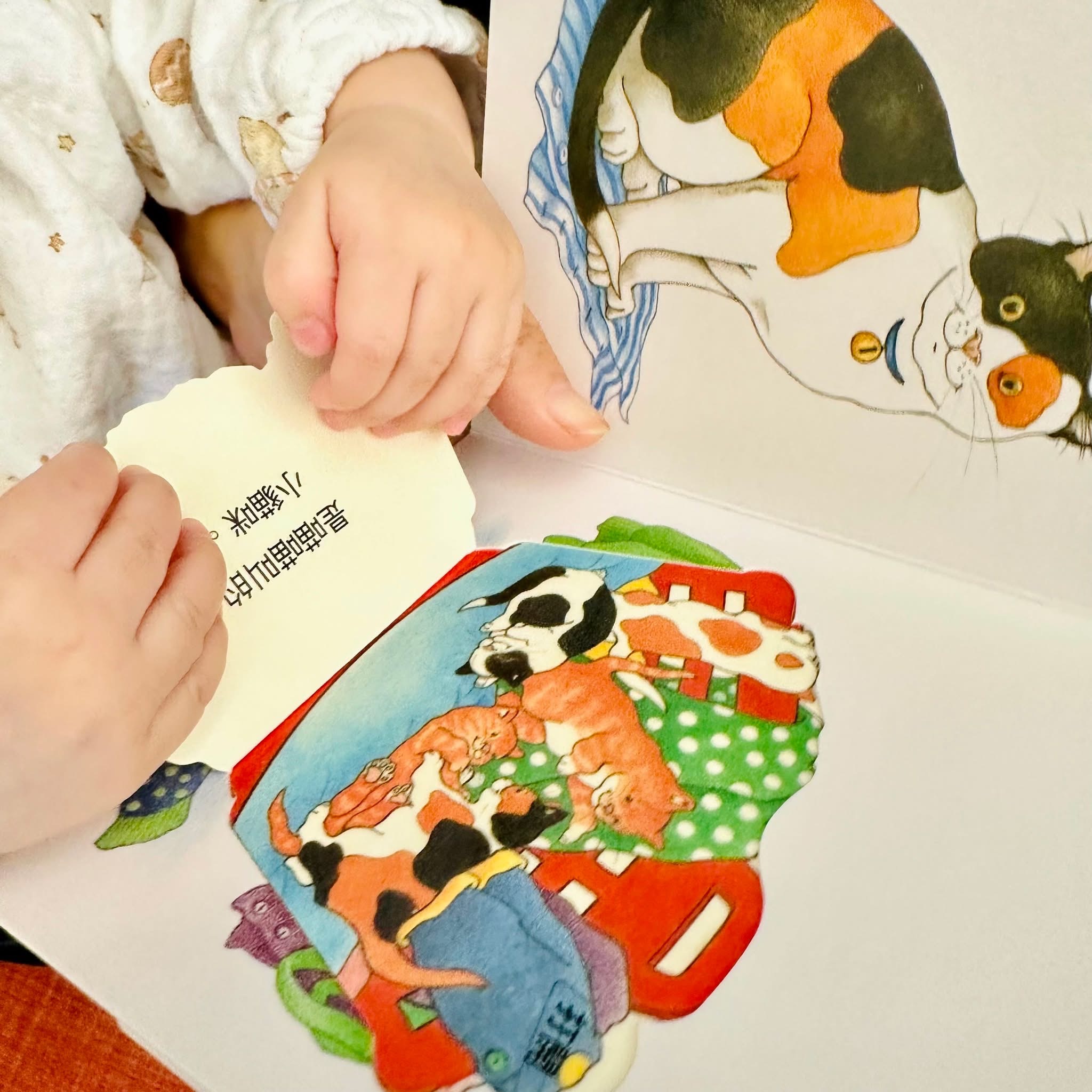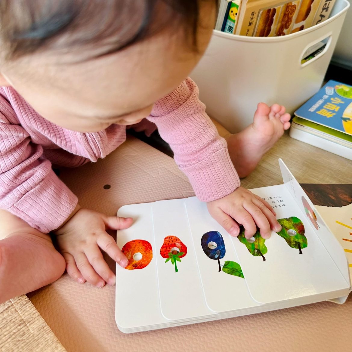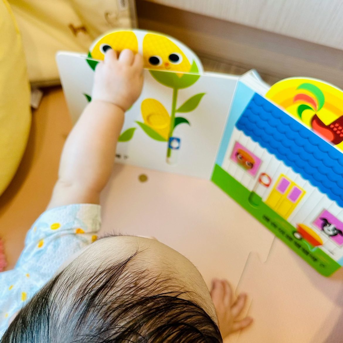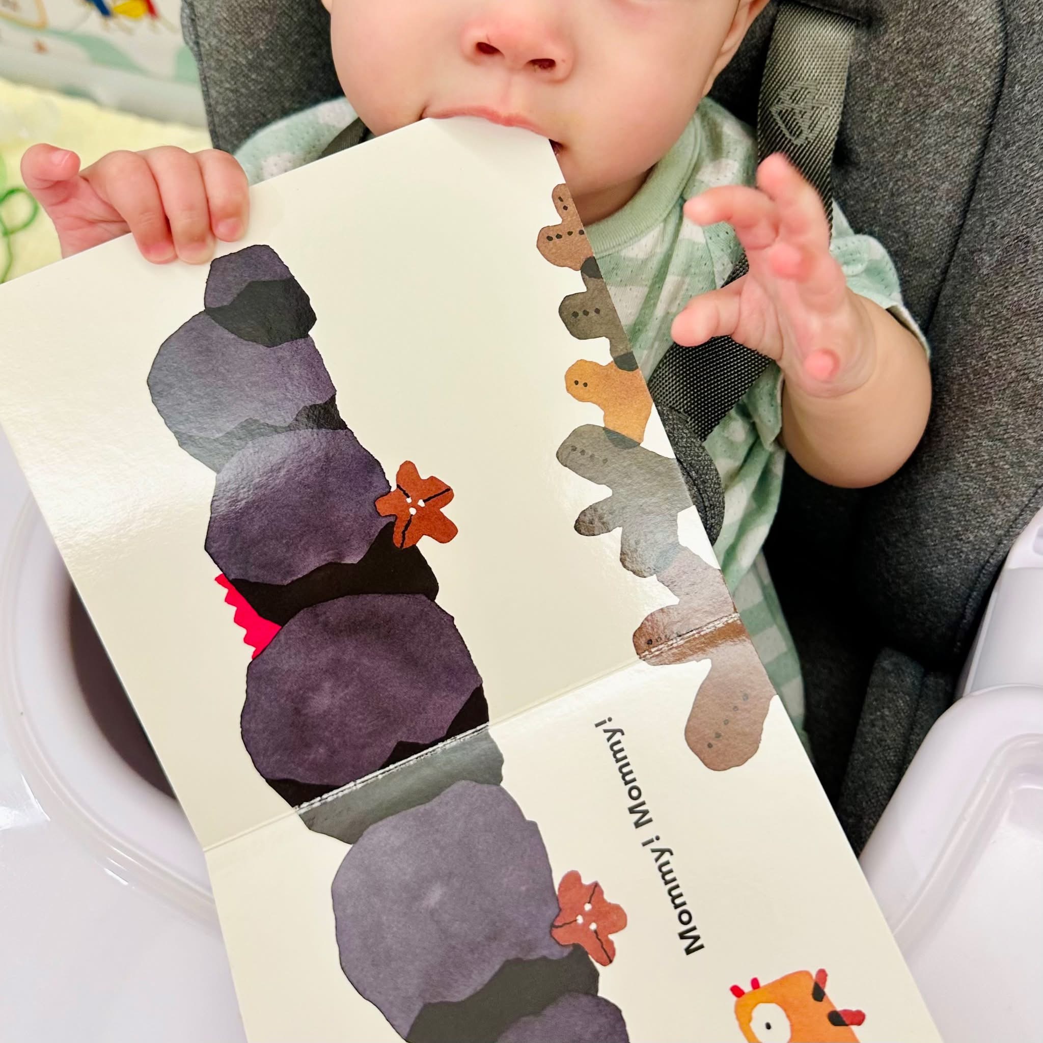 而且,最近她喜歡當小小搬運工,可以一個人把書或玩具搬來搬去,有時能獨自玩 10 分鐘樂此不疲(對爸媽來說多麼珍貴的時間啊!)10 月大的小魚,小手非常有力,但還不太會操控力道,所以很適合硬頁書,硬頁書有個絕妙的設計,就是翻頁之後,下一頁也會微微翹起,讓寶寶的小手有空間可以把手指塞進那個冒出來的空間裡,很順利地再翻下一頁。
