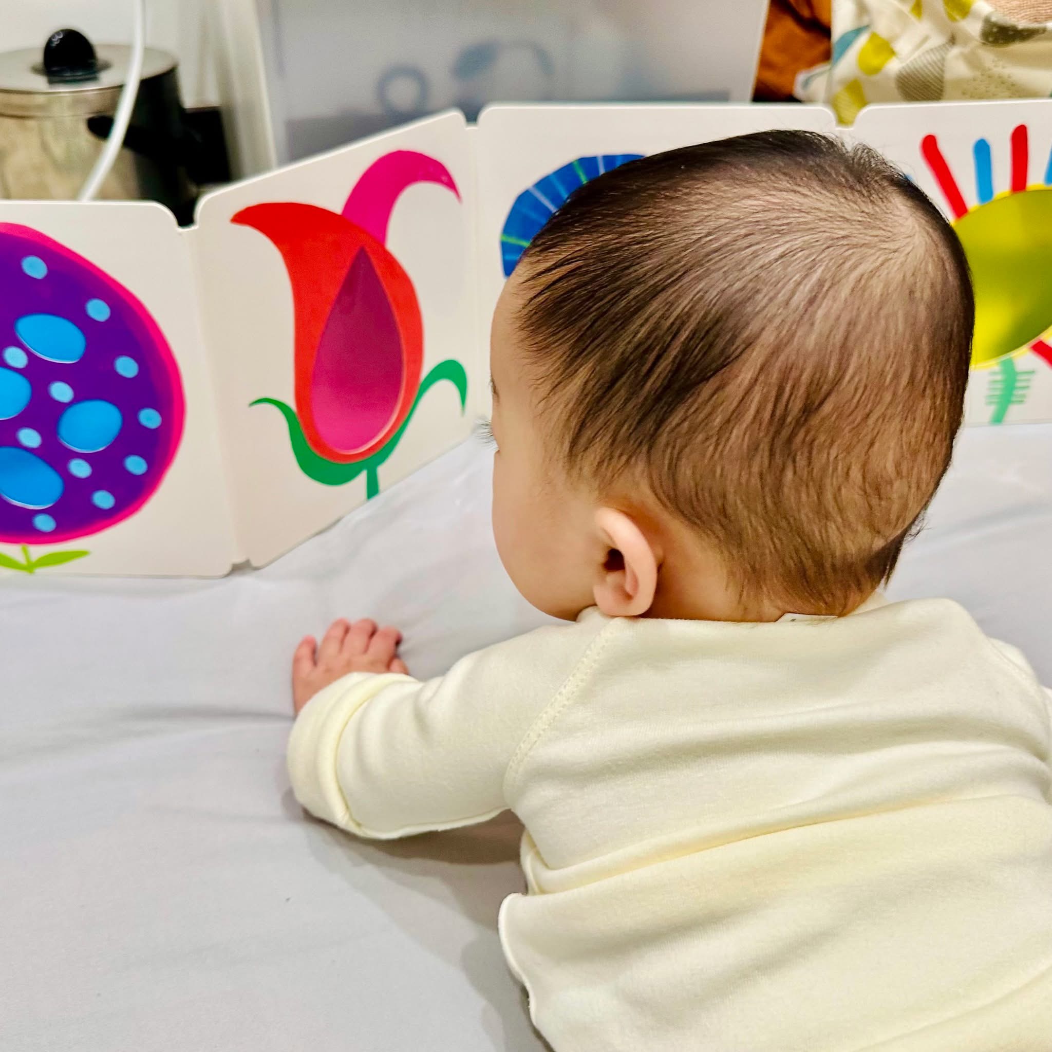 赫威.托雷的《小花園》很有趣,它沒有字,但每一頁都有不同顏色與形狀的半透明膠片,書頁能夠層層堆疊,或是展開來變成一條長長的小屏風,敲敲拍拍膠片還能像打鼓一樣發出咚咚咚的聲音,小魚昨天自己一頁一頁翻開來盯著看,彷彿就像在花園裡欣賞不同的花朵。下次想要試試看用手電筒製作出彩色光影的效果,看看寶寶會有什麼反應。